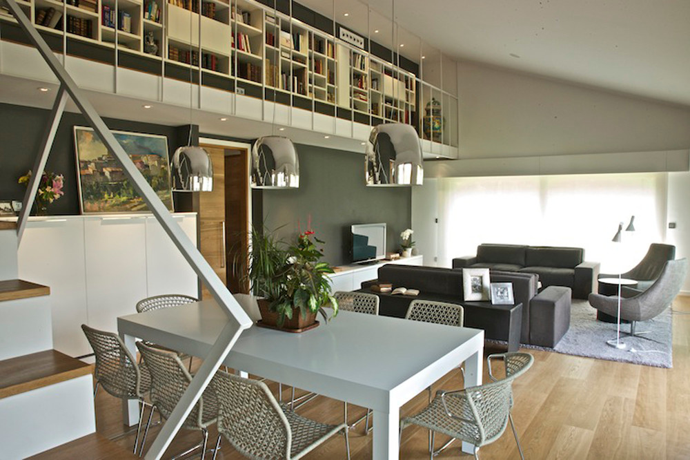 Para iluminar la mesa de comedor, de diseño rectangular, hemos colocado tres lámparas de techo distribuidas a lo largo de la mesa. Del comedor accedemos a unas escaleras que conducen a la planta superior. En esta zona hemos colocado una estantería de suelo a techo que sirve como decoración y proporciona almacenaje extra.