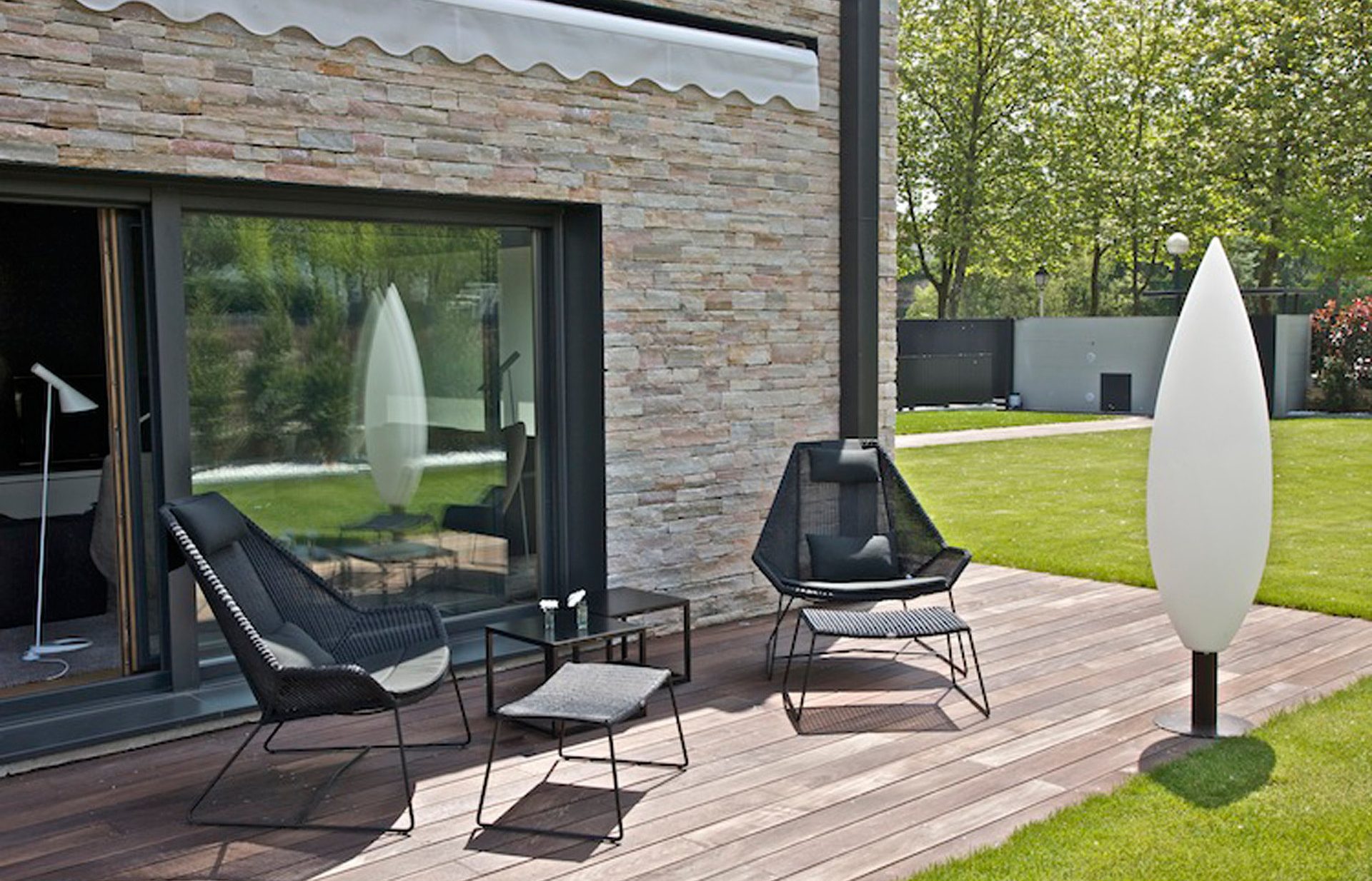 Uno de los grandes atractivos de la decoración de este chalet de Vitoria es la terraza. Para amueblar este espacio hemos optado por muebles de fibras en tonos oscuros y una gran lámpara de exterior, también de diseño moderno en línea con el resto del mobiliario.