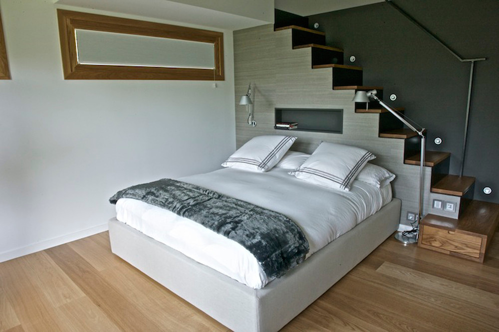 En la planta inferior encontramos un segundo dormitorio y una zona de ocio. En la reforma y decoración de esta habitación, optamos por utilizar las escaleras de acceso como cabecero de cama. Un nicho dentro de la pared ofrece espacio de almacenaje y dos lámparas a cada lado de la cama iluminan la zona de descanso.