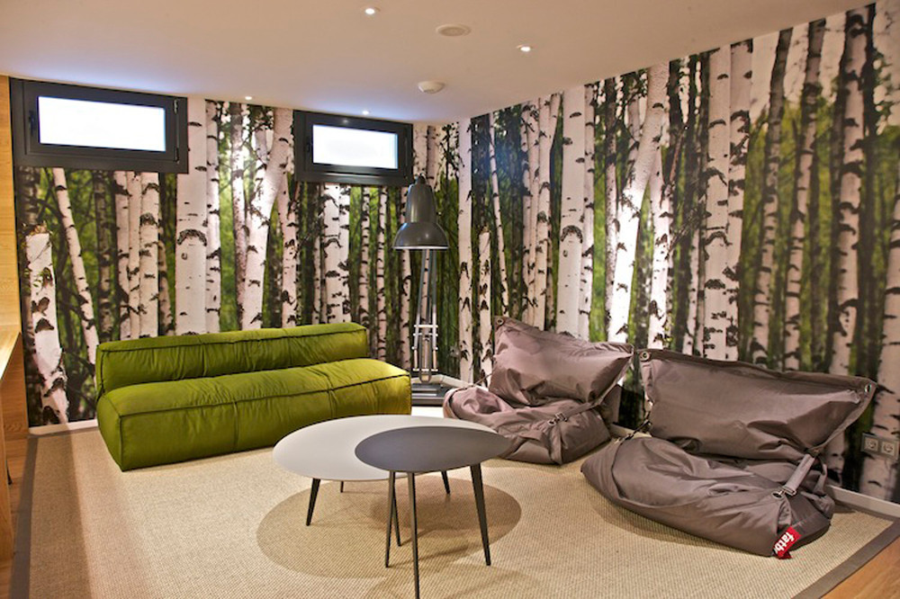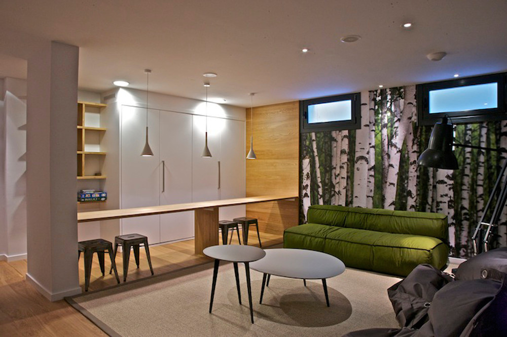 La zona de ocio es un gran espacio multidisciplinar que hemos amueblado con sofás modulares y una barra americana con taburetes y lámparas de techo distribuidas a lo largo de toda la mesa. Para conectar este espacio con el exterior, hemos optado por un papel pintado con motivos naturales.