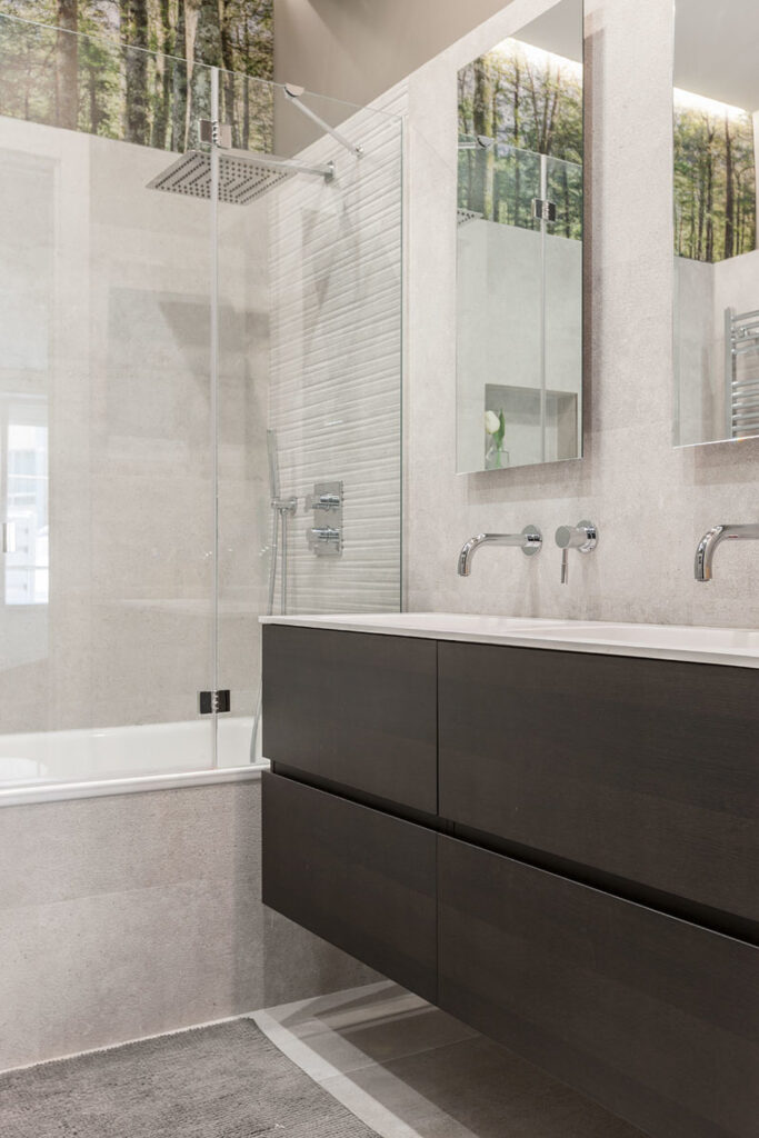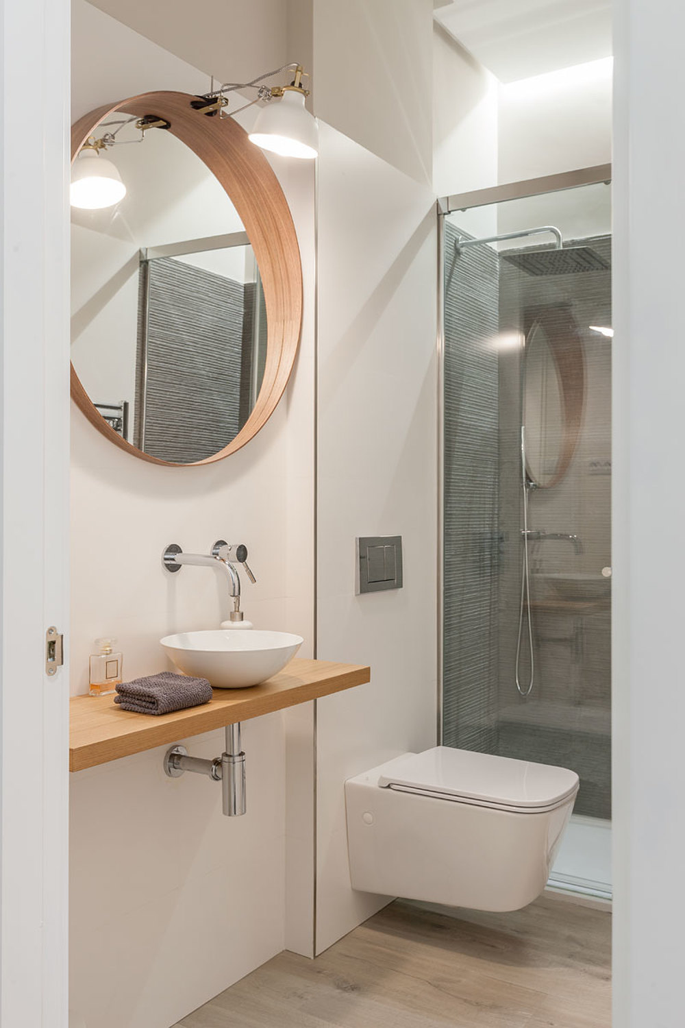 En la zona de los dormitorios también hemos apostado por el blanco y la madera clarita. De esta forma hemos logrado que la decoración de esta vivienda del ensanche bilbaíno resulte tan relajante y luminosa. Por último, cabe destacar la decoración de los cuartos de baño. Una vez más, la madera noble y el blanco vuelven a ser protagonistas, logrando así un baño elegante y atemporal.