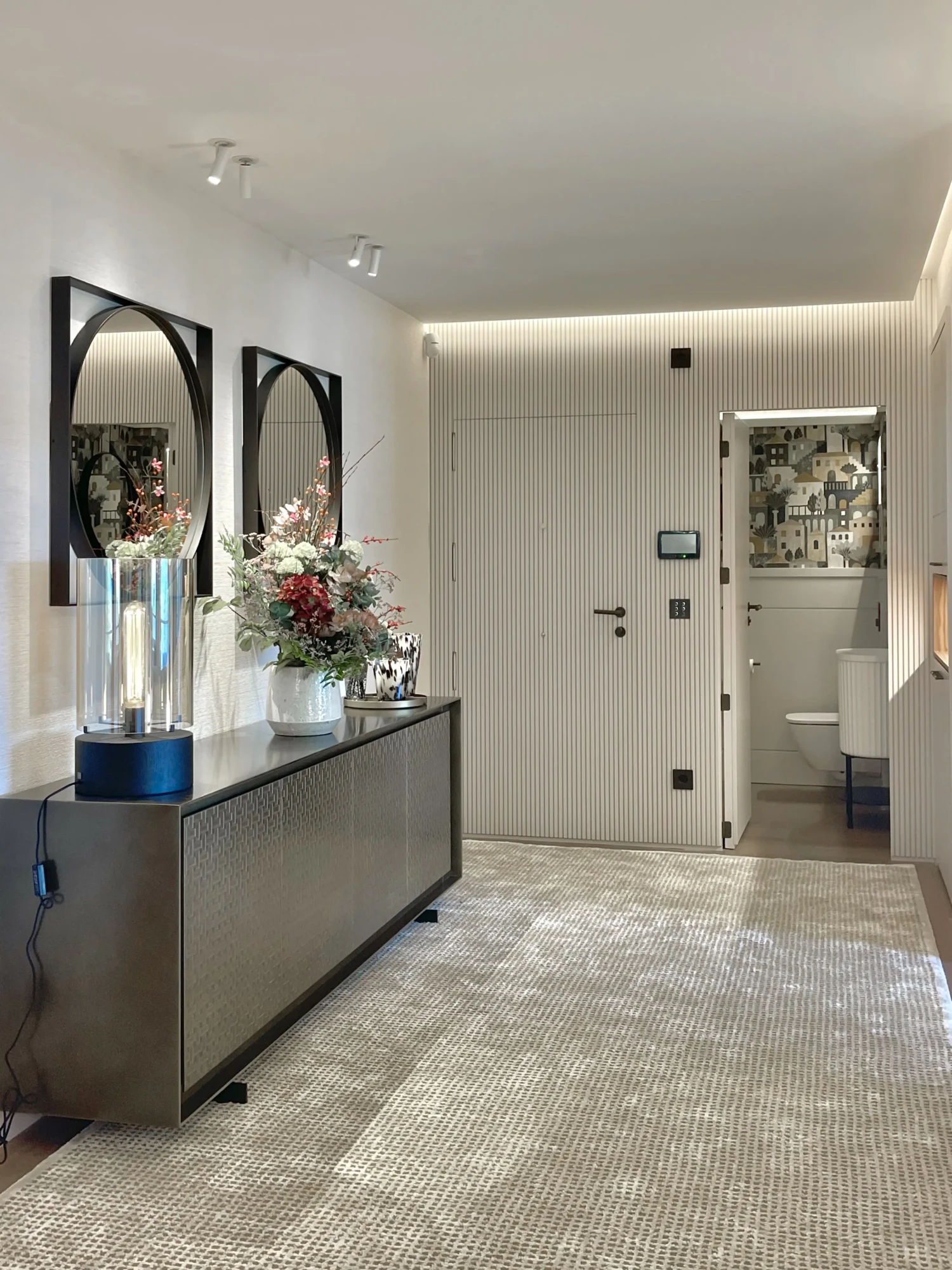 Nada más acceder a la vivienda, nos recibe una amplia entrada cuidadosamente diseñada, donde el mobiliario a medida aporta orden, calidez y personalidad. En este espacio se encuentra también un baño de invitados donde la puerta se integra con la pared pasando totalmente desapercibida. La entrada conecta con el salón a través de una celosía con puertas correderas que permiten separar ambientes sin perder luminosidad ni continuidad visual.