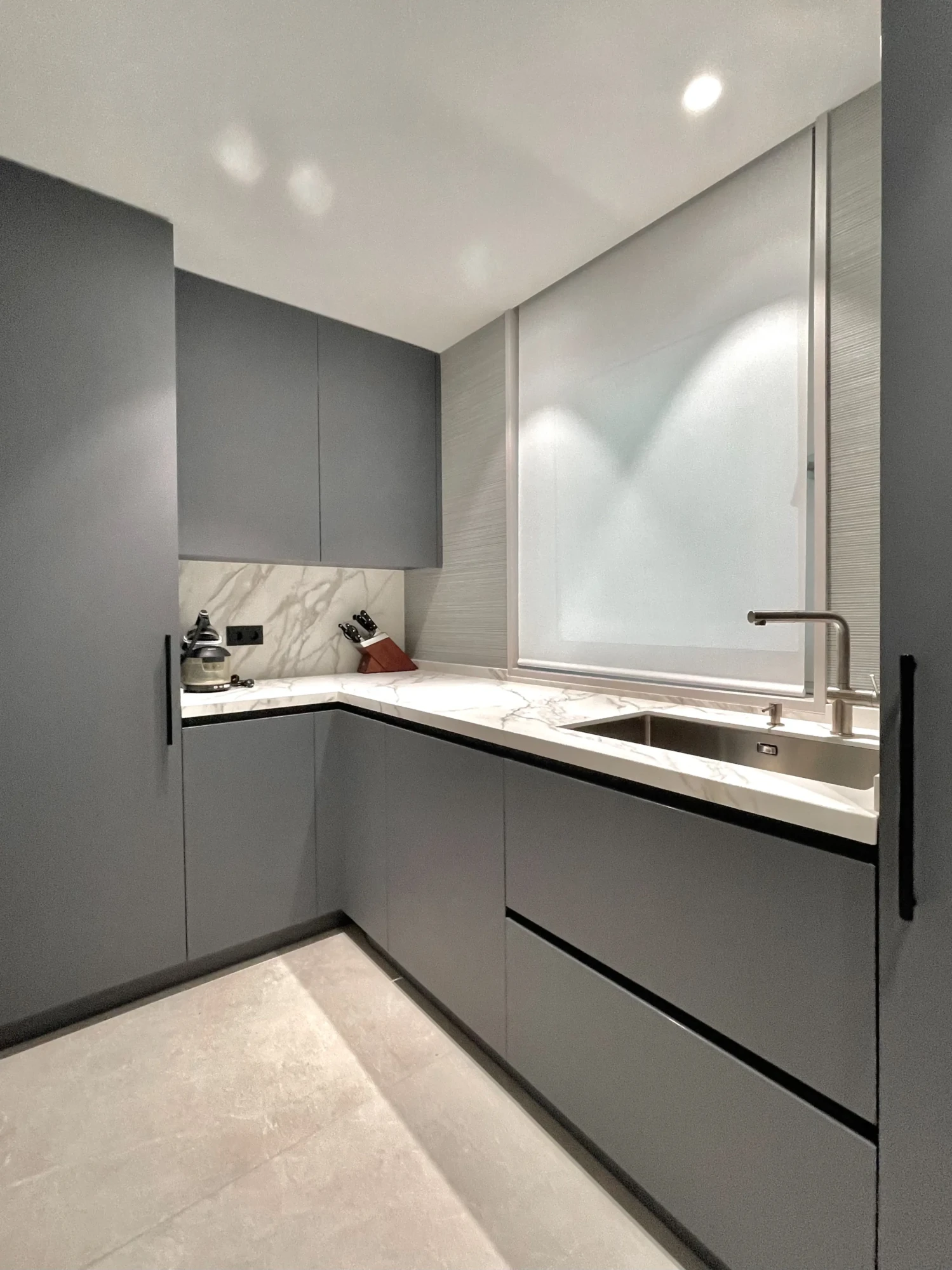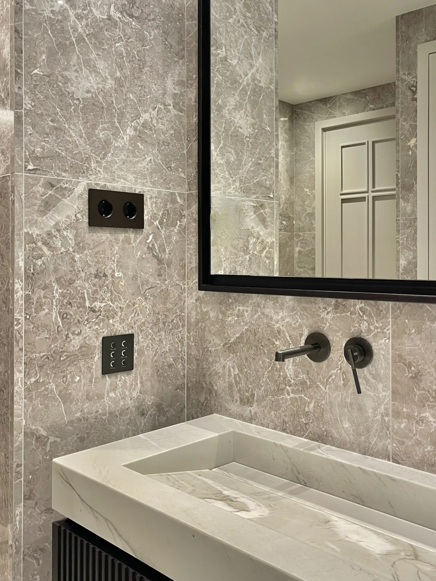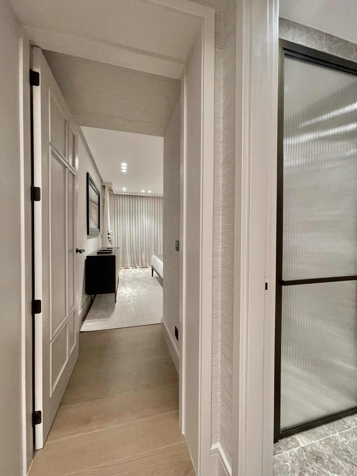 Uno de los detalles más singulares es una puerta oculta en el revestimiento que conduce discretamente al cuarto de limpieza, una solución elegante que conecta estancias sin alterar la pureza del diseño.