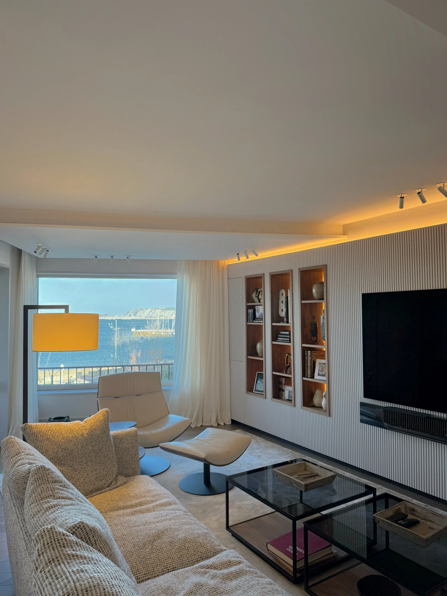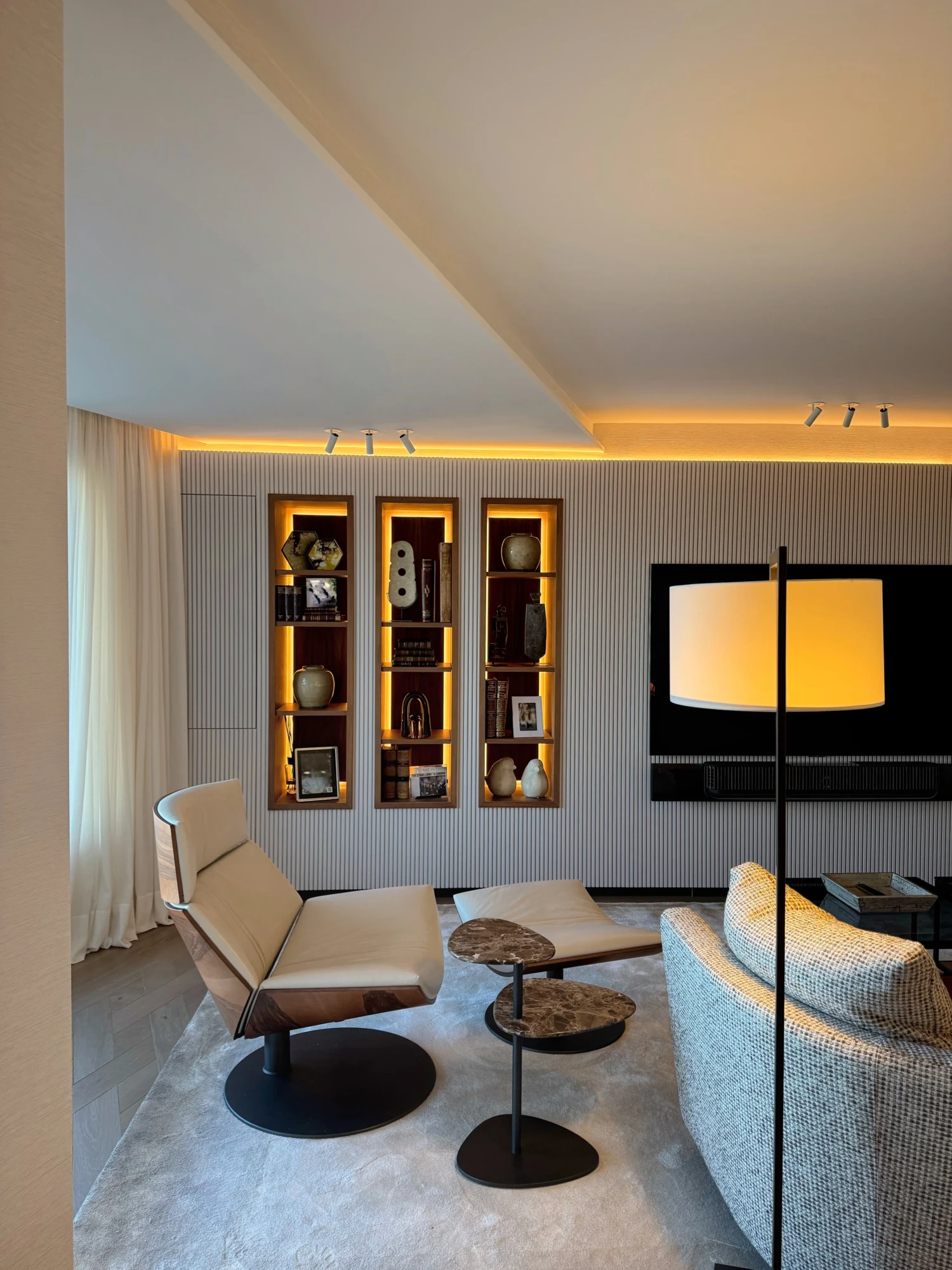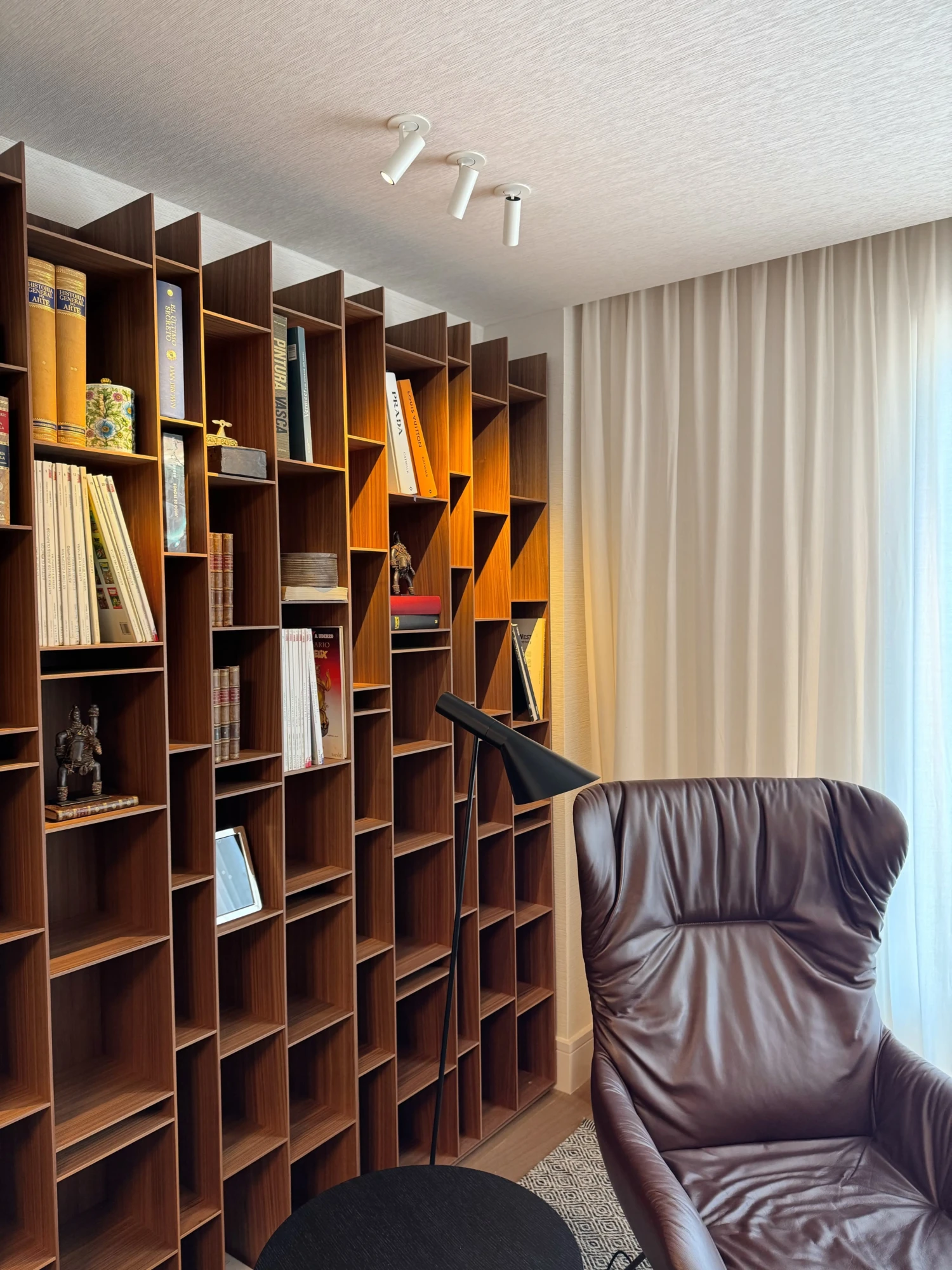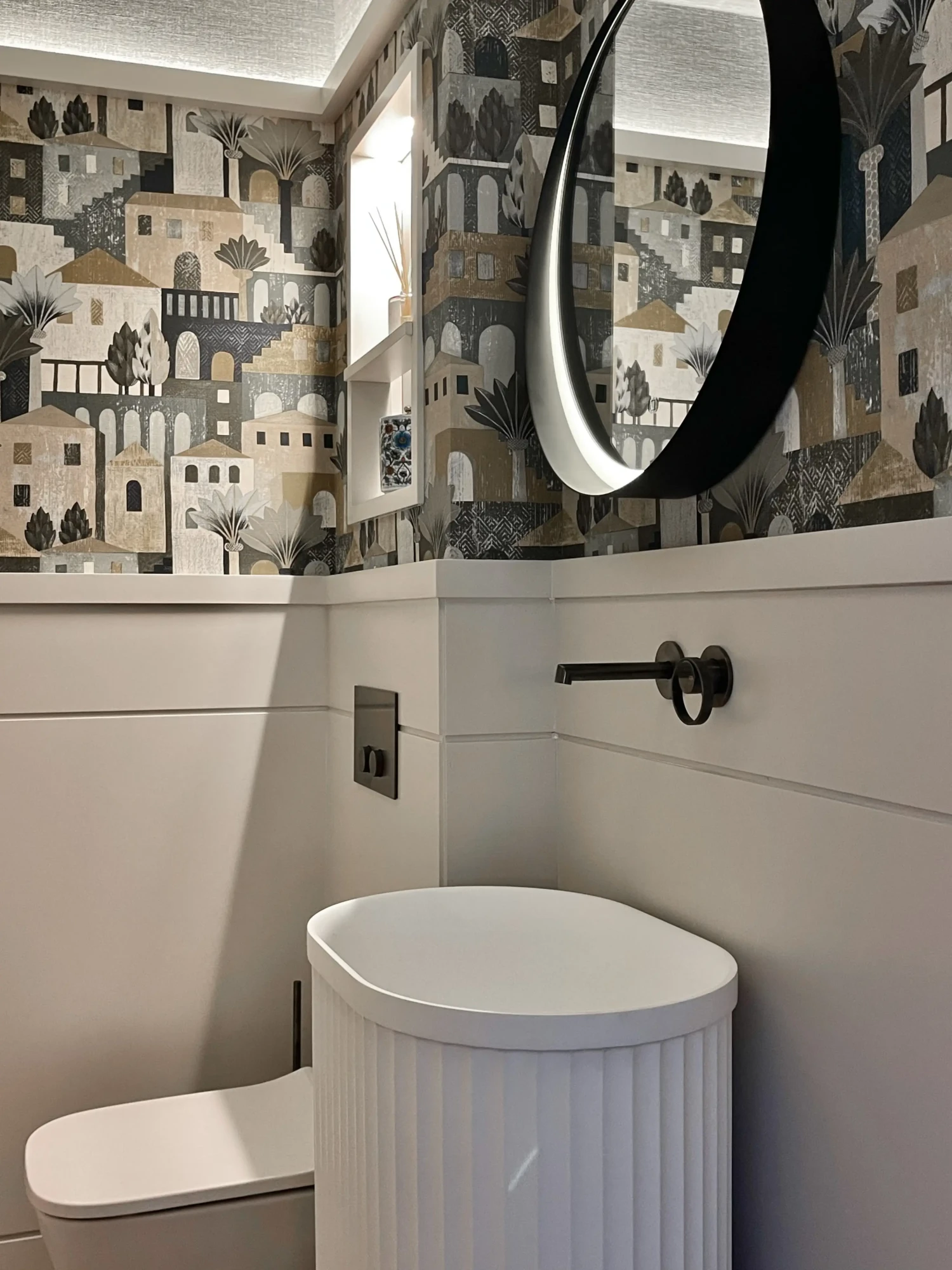 Uno de los detalles más singulares es una puerta oculta en el revestimiento que conduce discretamente al cuarto de limpieza, una solución elegante que conecta estancias sin alterar la pureza del diseño.