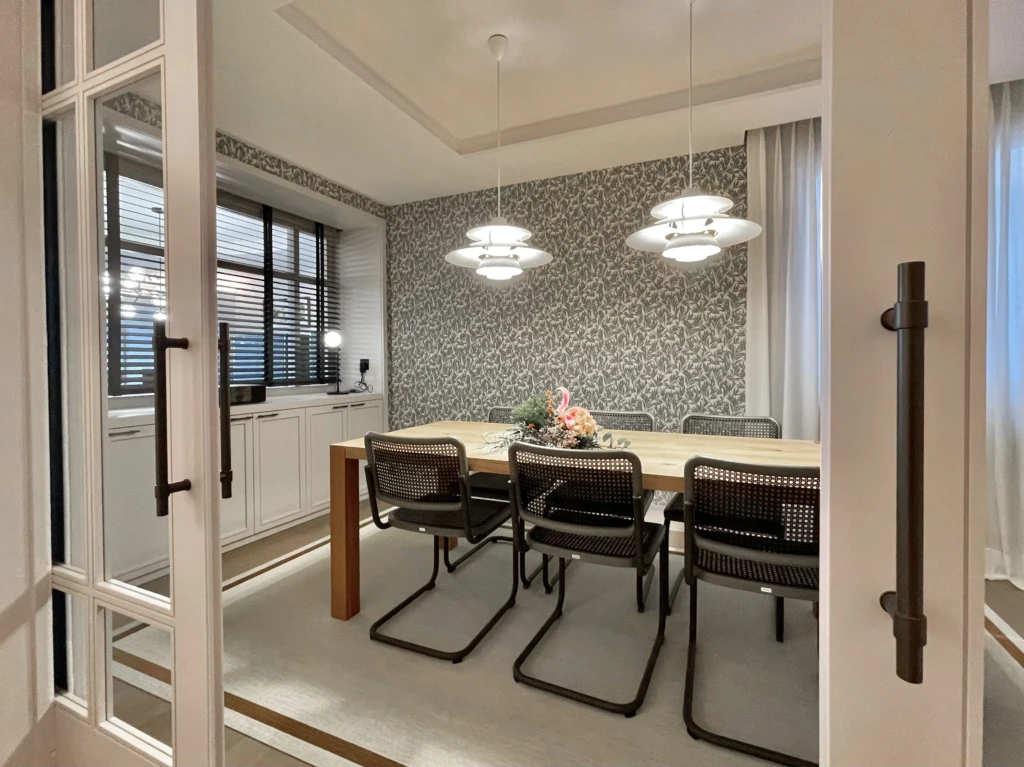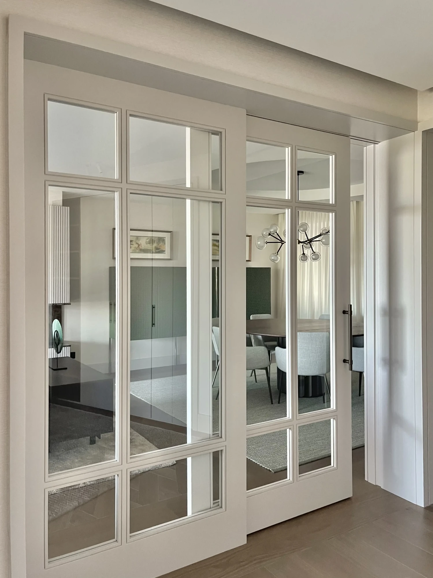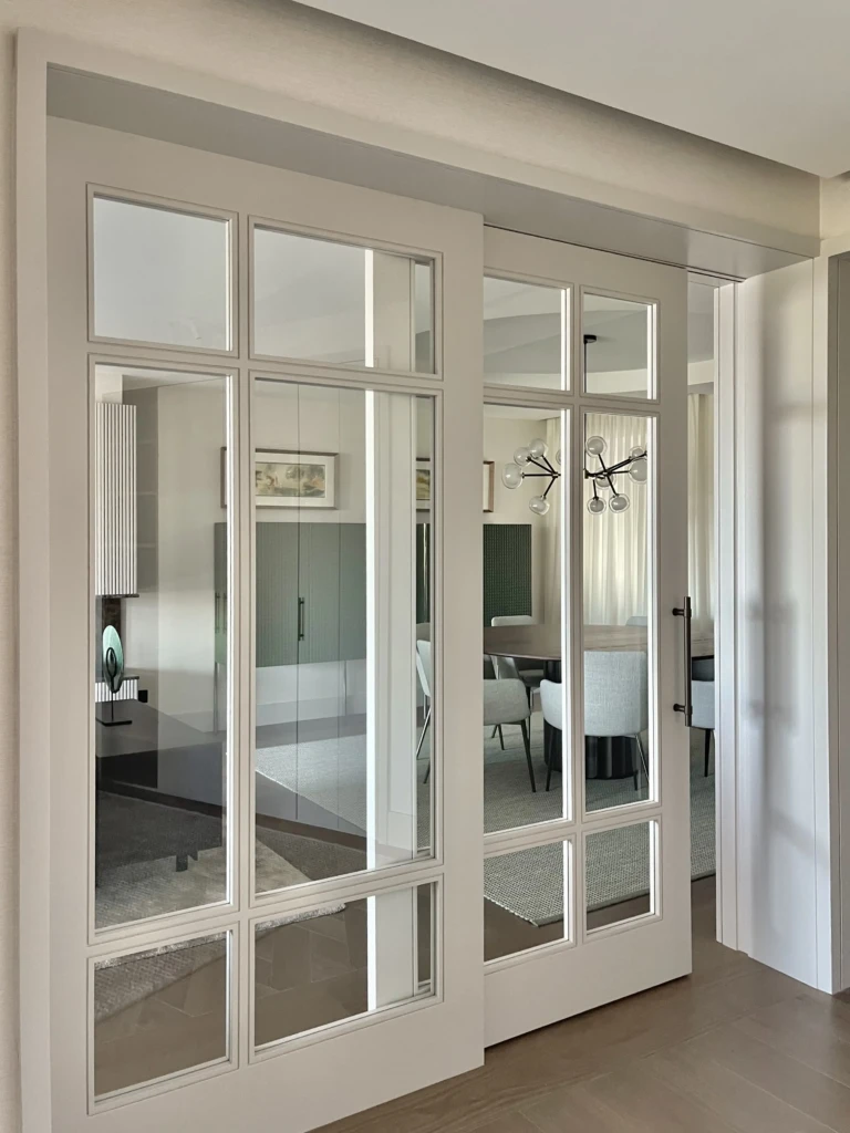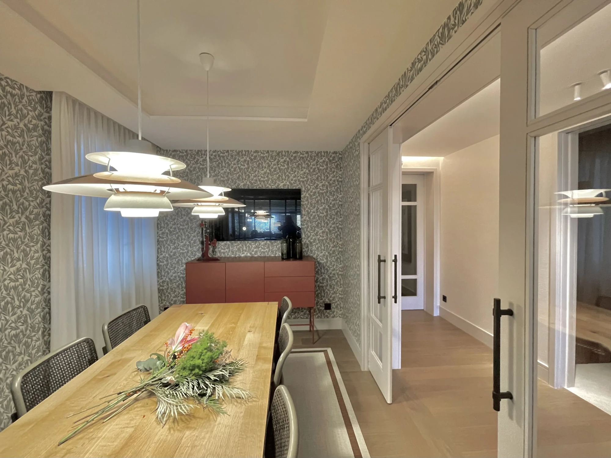 El comedor queda delimitado del pasillo mediante una puerta acristalada que crea una transición ligera y preserva la entrada de luz.