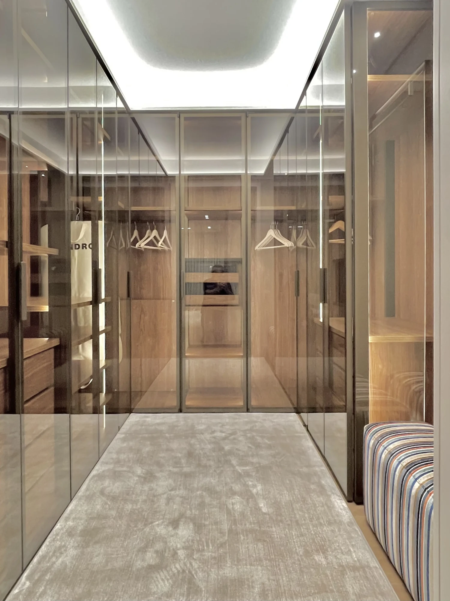 Al acceder, un vestidor revestido en tonos madera da la bienvenida, donde orden y elegancia conviven de forma equilibrada. Las puertas acristaladas con perfiles oscuros aportan un aire contemporáneo y sofisticado. Cada módulo está diseñado para ofrecer amplitud visual y una organización impecable.