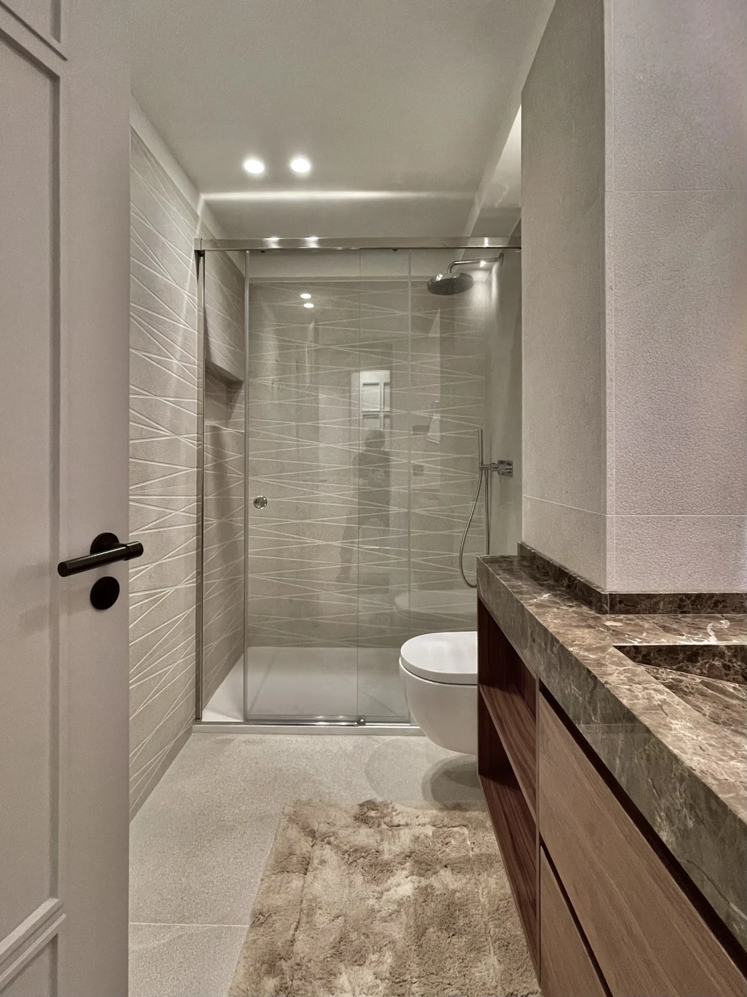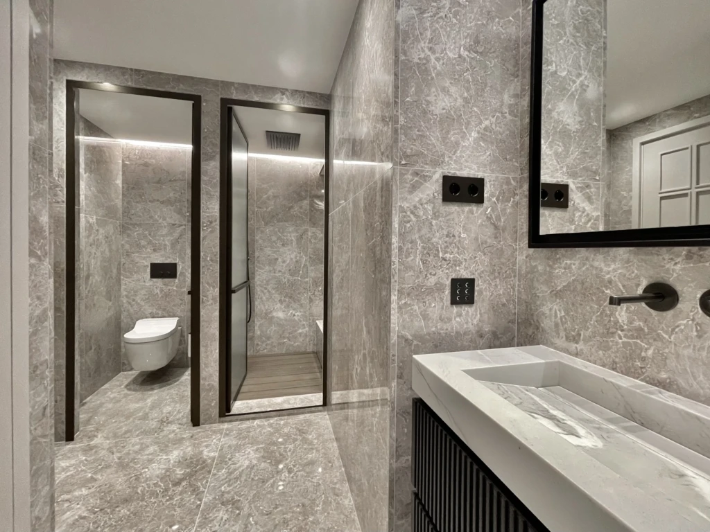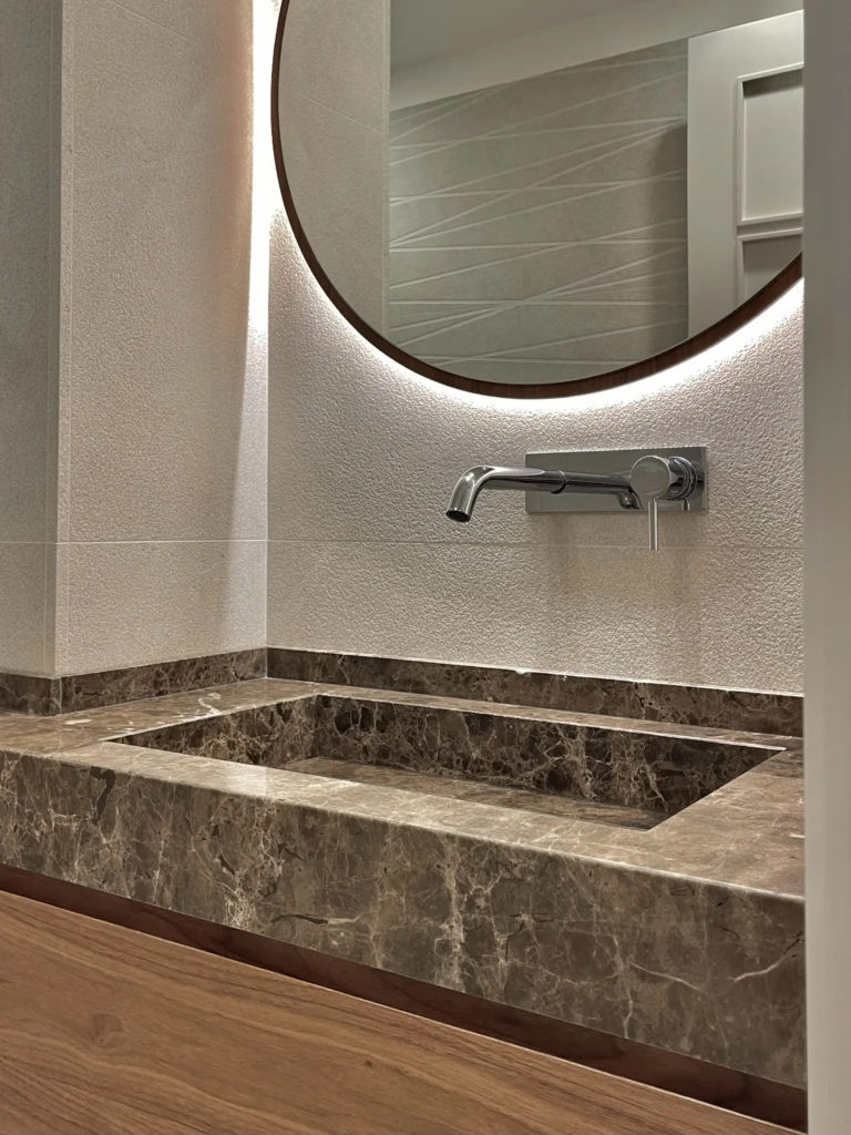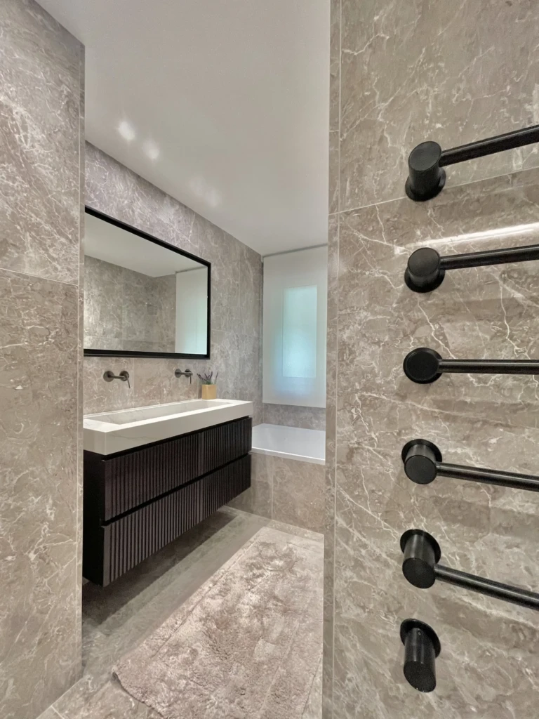 El recorrido continúa hacia el baño principal, un espacio con gran personalidad. Revestido por completo en un acabado mármol con vetas marcadas, transmite solidez y distinción. Los detalles en bronce (desde la grifería hasta los marcos de las divisiones) aportan contraste y modernidad, logrando un equilibrio perfecto.