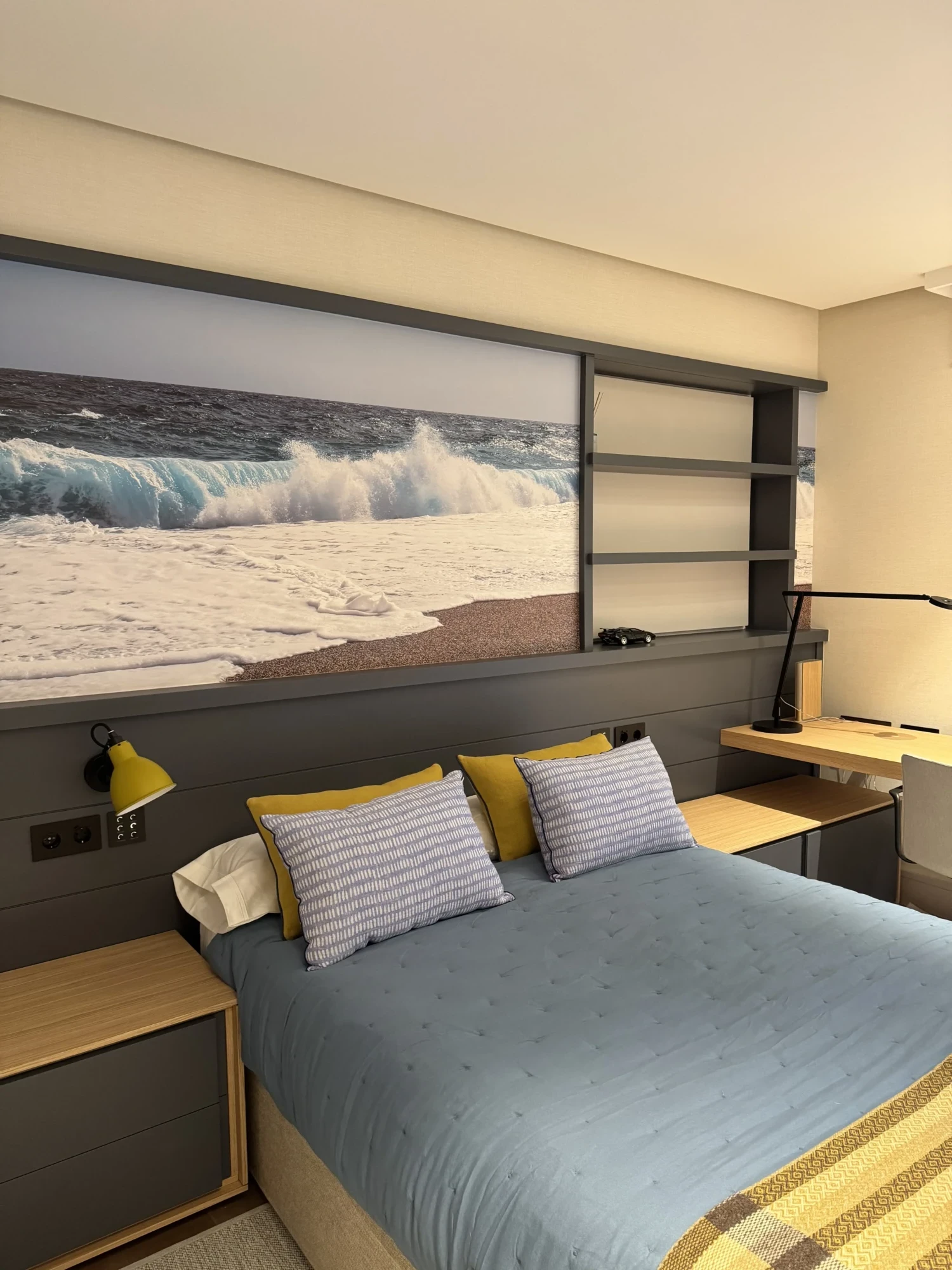 El segundo dormitorio apuesta por una gama de azules y beiges, con una fotografía sobre el cabecero que actúa como elemento protagonista.