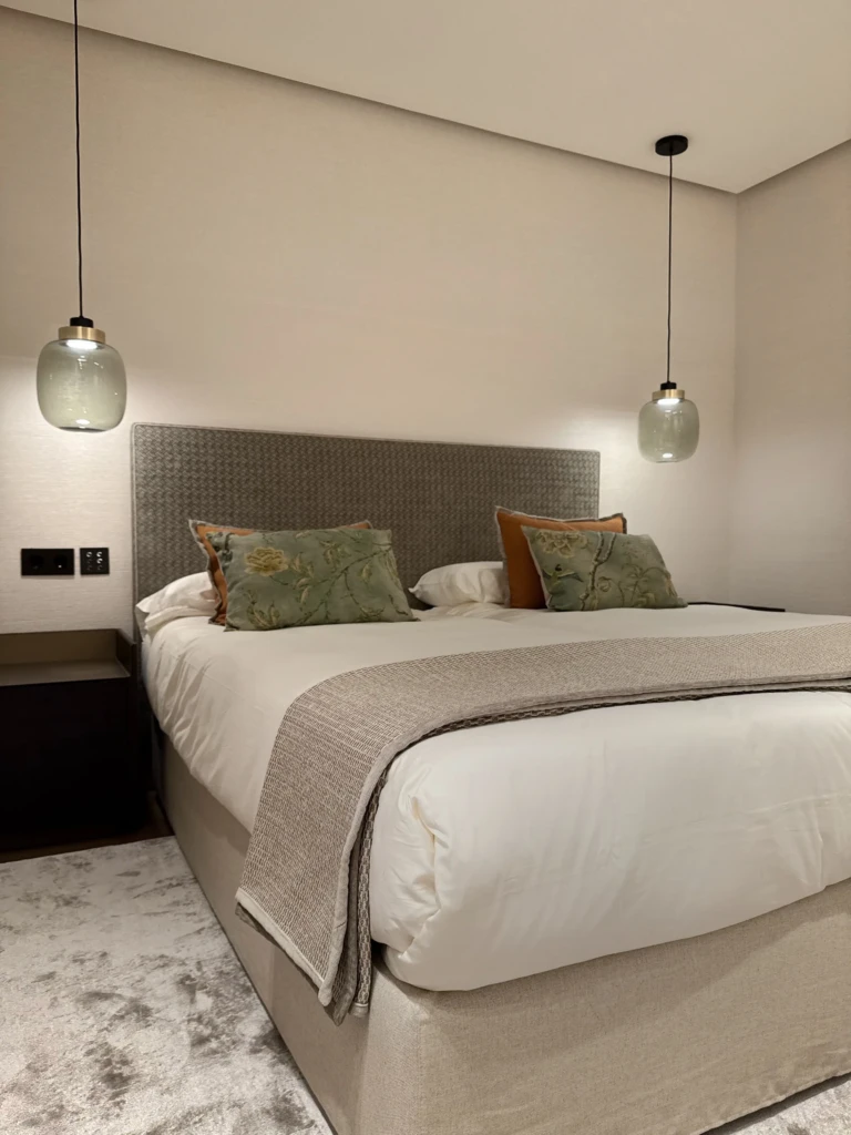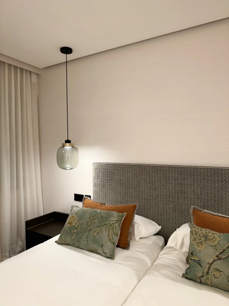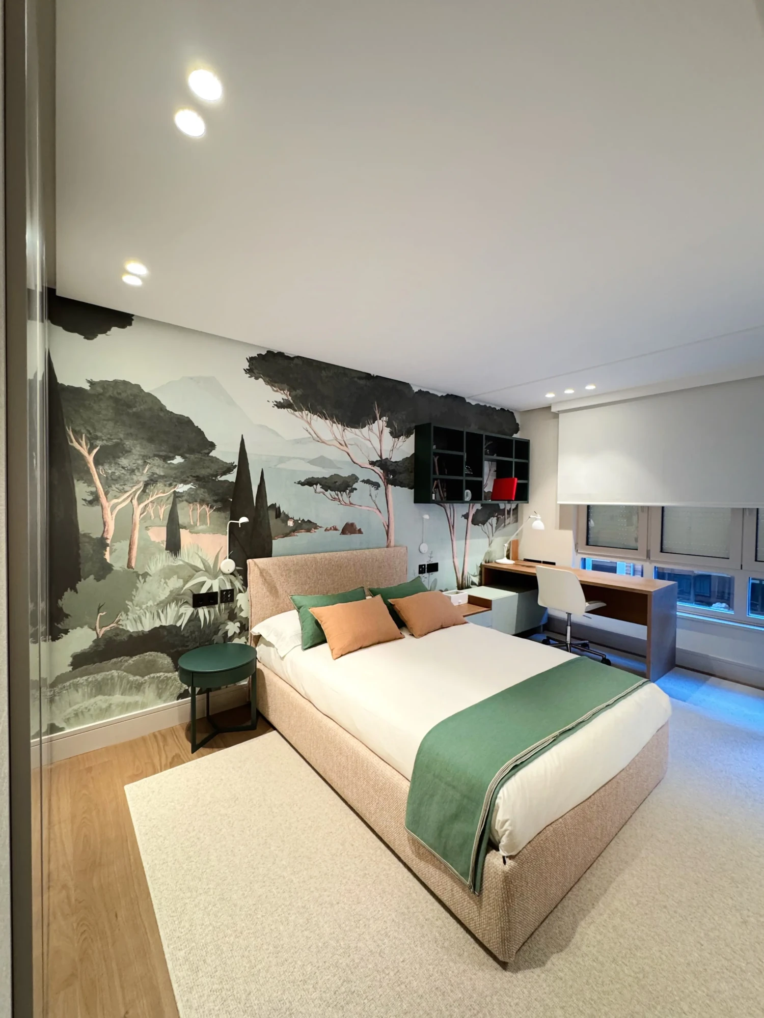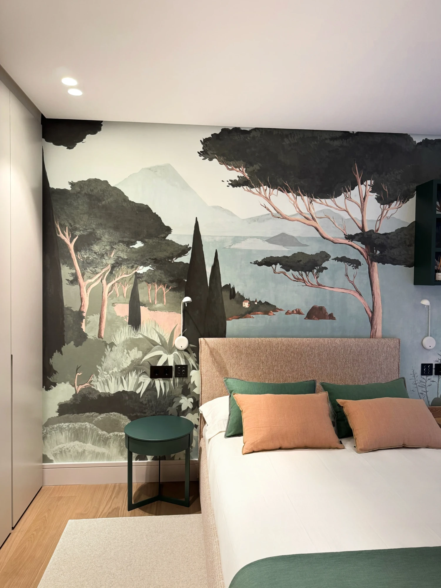El primer dormitorio, se viste con tonos rosa empolvado y verdes, destacando el mural del cabecero que aporta un ambiente cálido y delicado.
