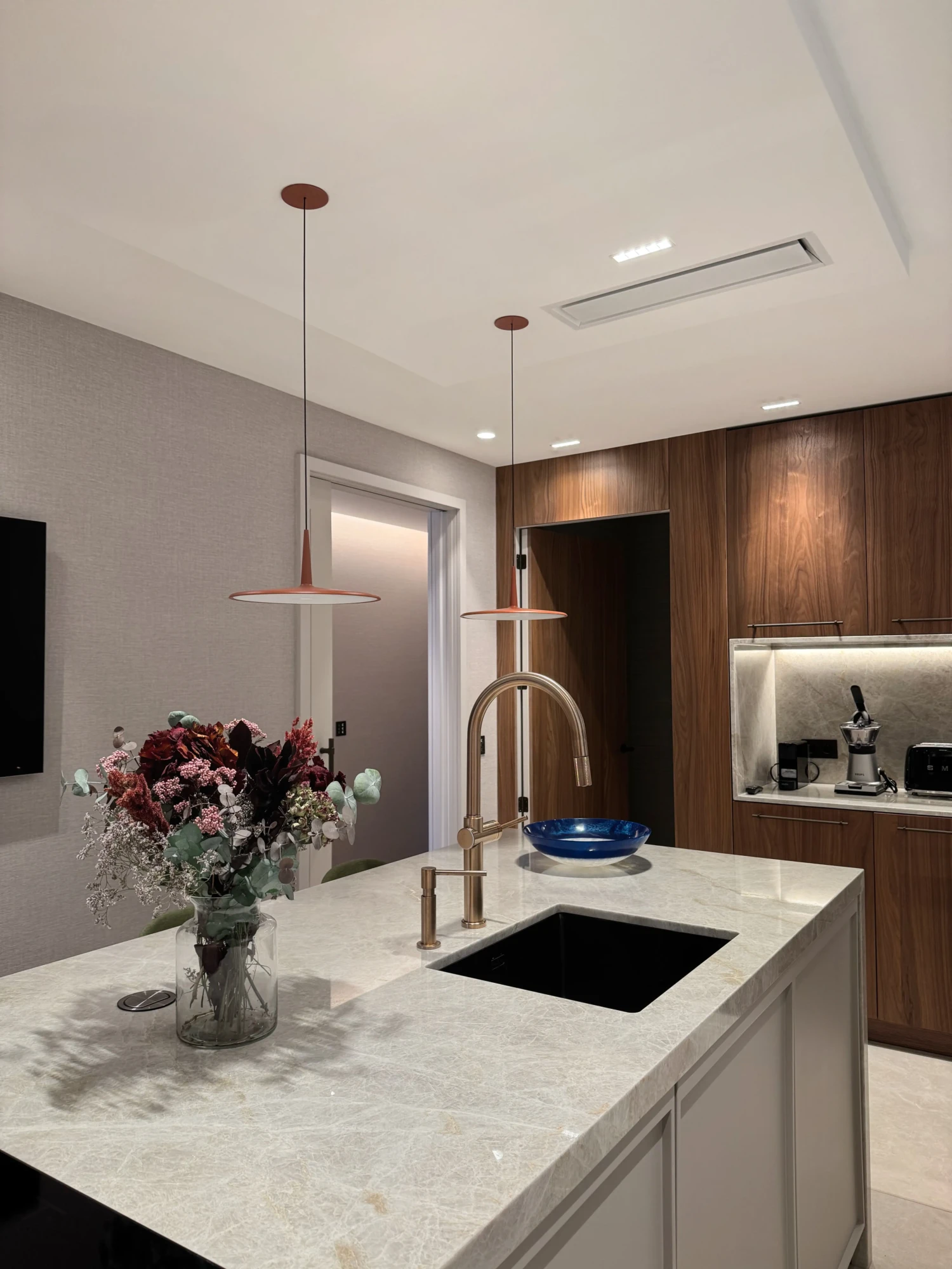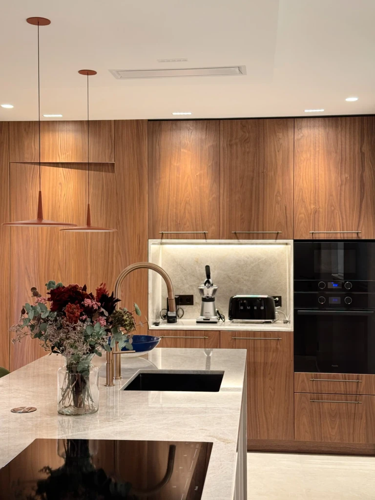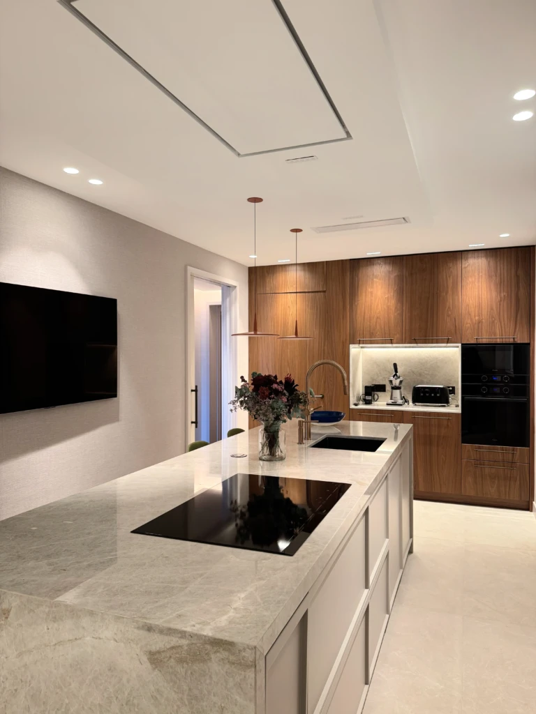 La cocina combina estética y eficiencia desde el primer vistazo. Diseñada en madera de nogal y lacado, se integra con naturalidad en el conjunto de la vivienda. La isla central, realizada en piedra natural, funciona como punto de encuentro y corazón operativo del espacio.