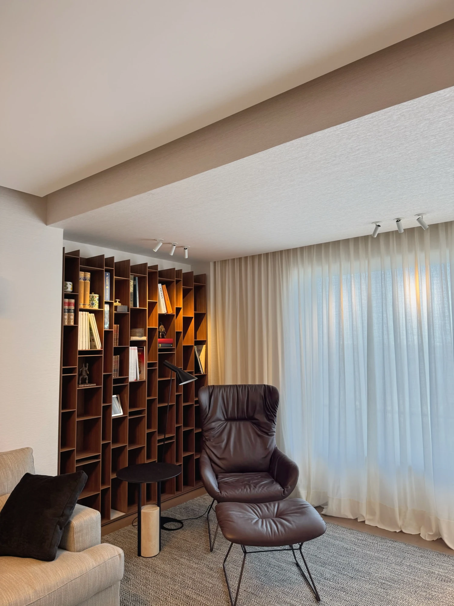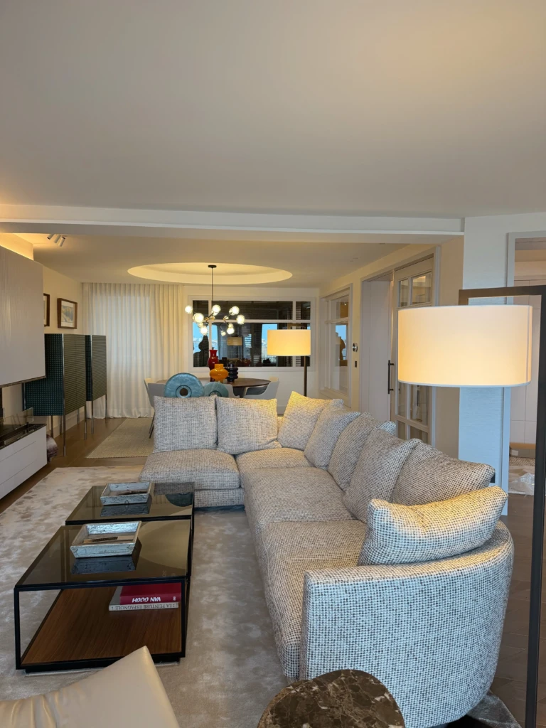 - Un segundo ambiente abierto, sin puertas, que aporta fluidez y amplitud, equipado con un pequeño sofá y una mesa auxiliar.