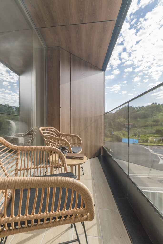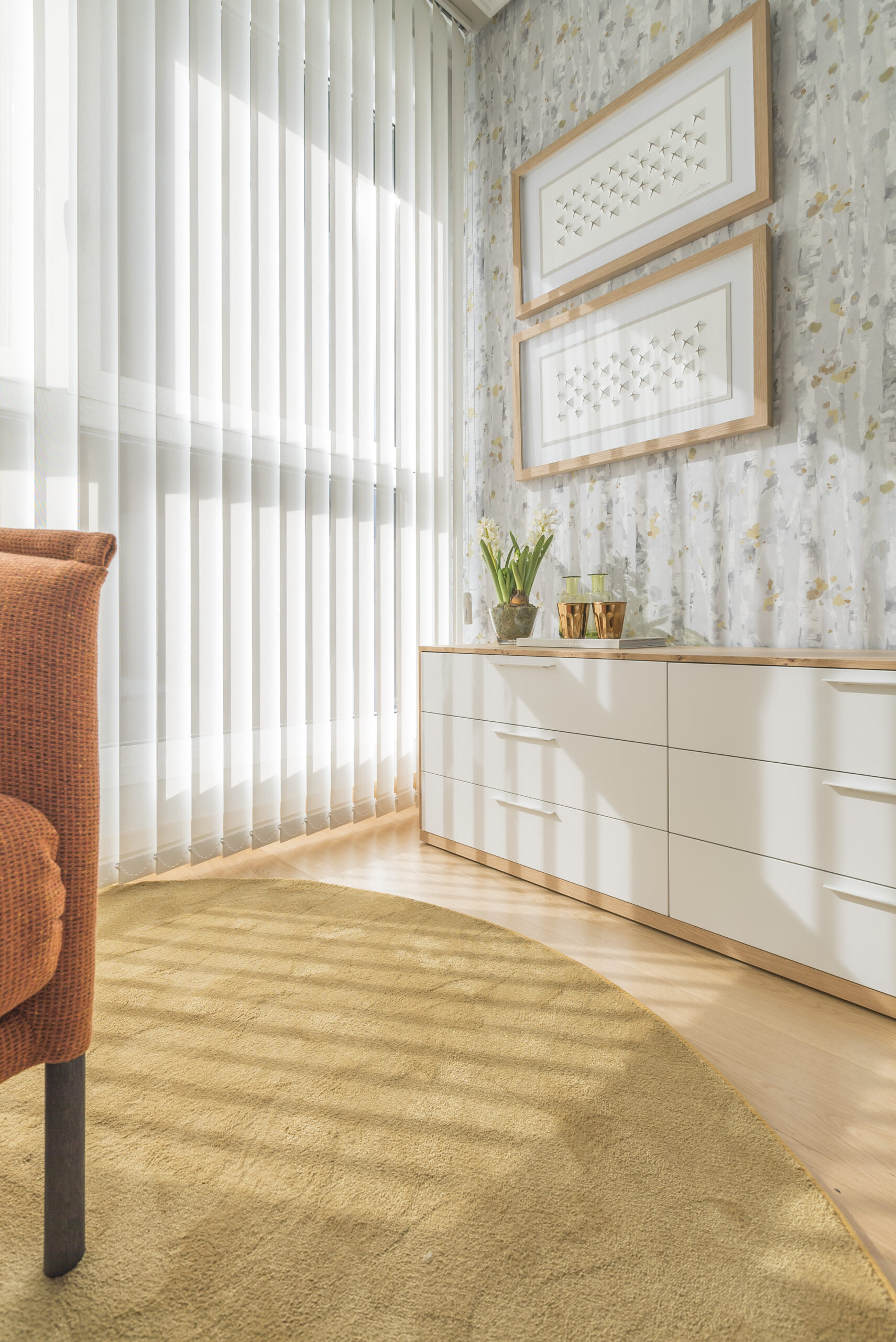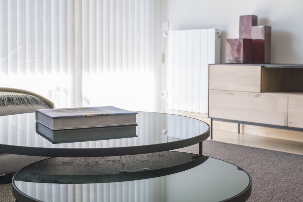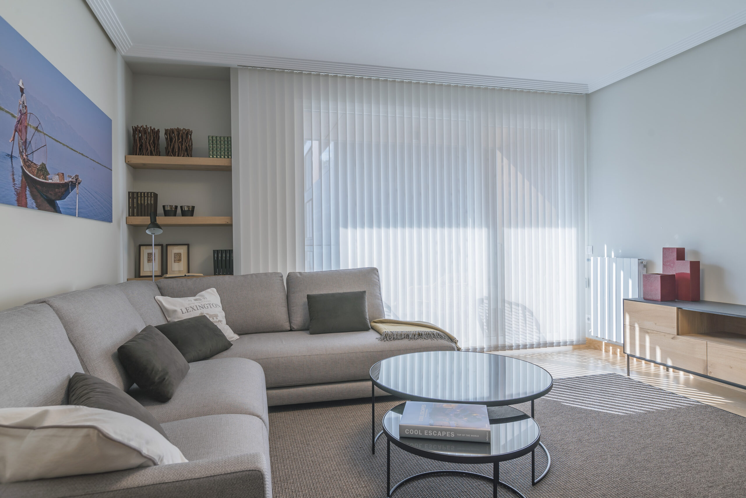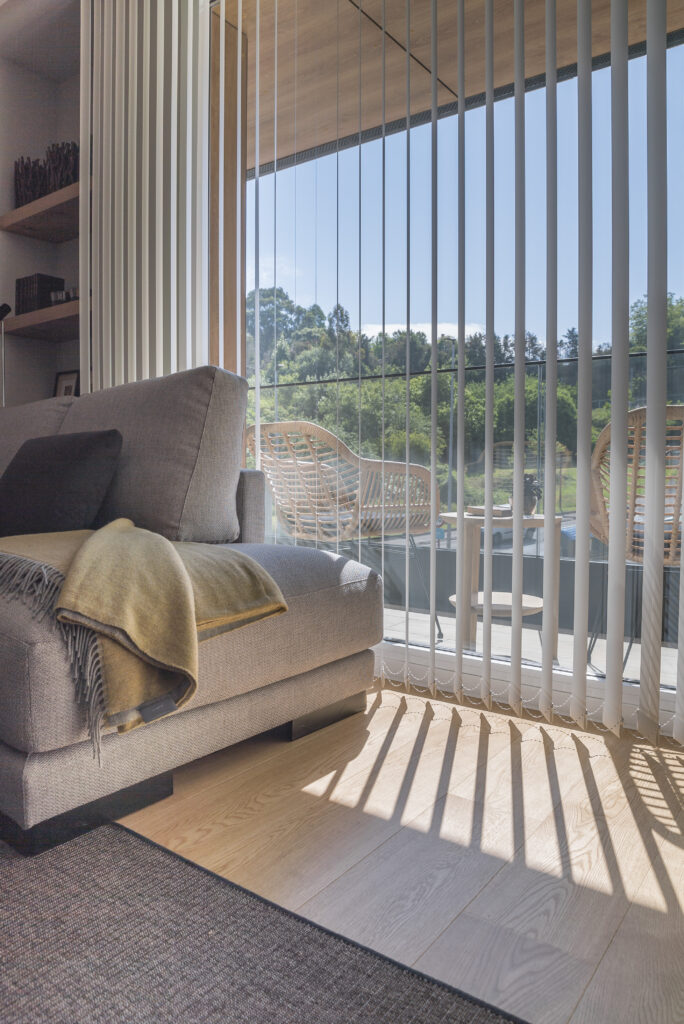 La siguiente zona a la que accedemos es el salón-comedor. Un espacio abierto, diáfano y luminoso. Los amplios ventanales que dan acceso a la pequeña terraza llenan de luz la zona de estar. En este sentido, hemos optado por cortinas verticales de color blanco para regular la intensidad de luz.