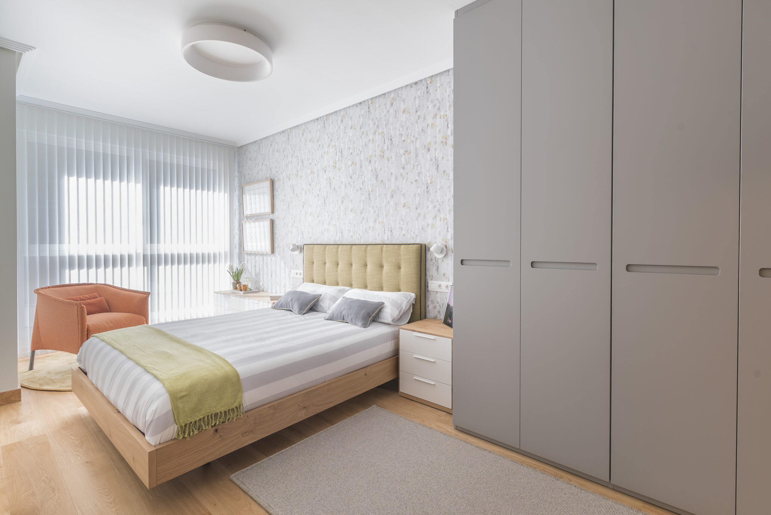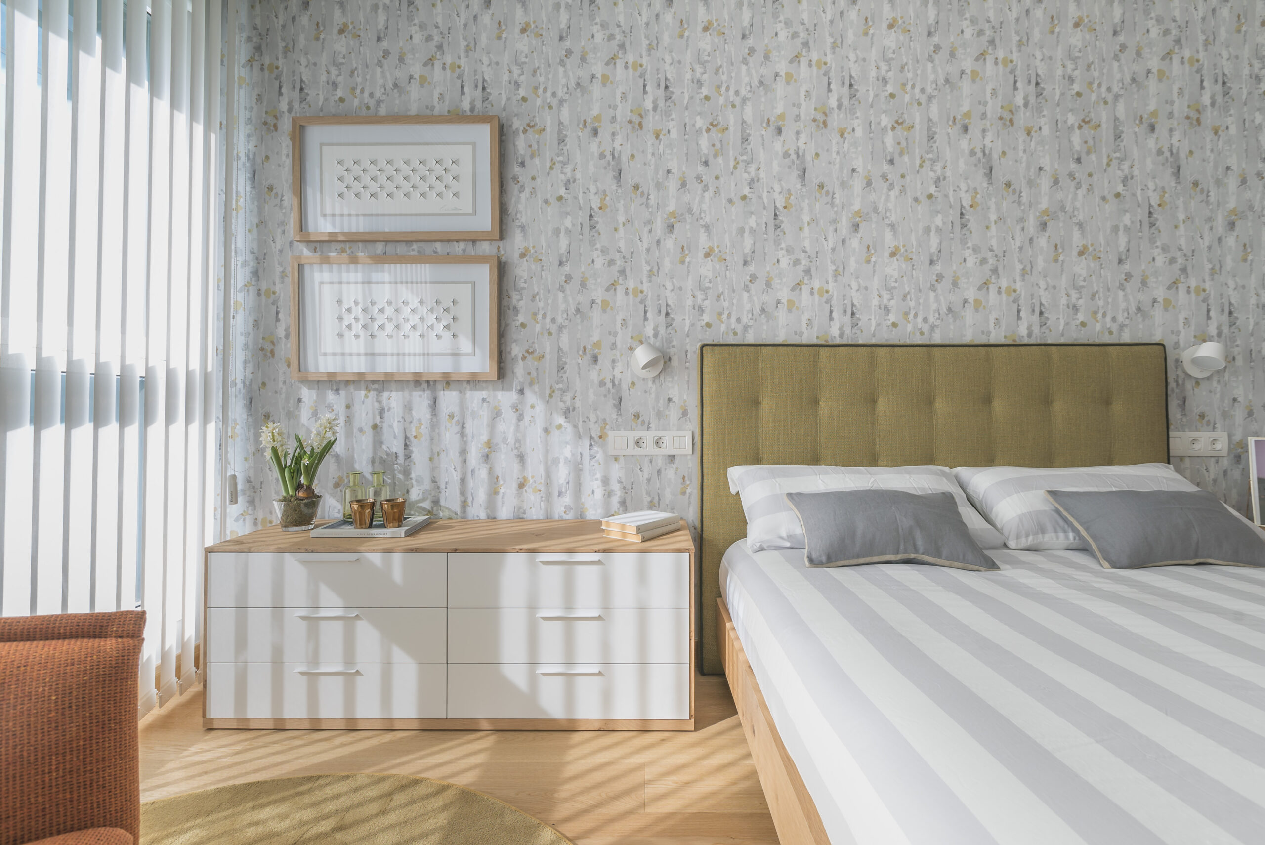 Por último accedemos a la zona de los dormitorios, que mantiene el mismo estilo decorativo que el resto de la vivienda. En el dormitorio principal destaca un papel pintado con motivos florales y un cabecero de cama tapizado que pone la nota de color.