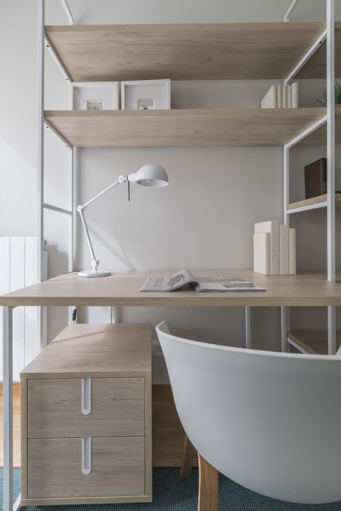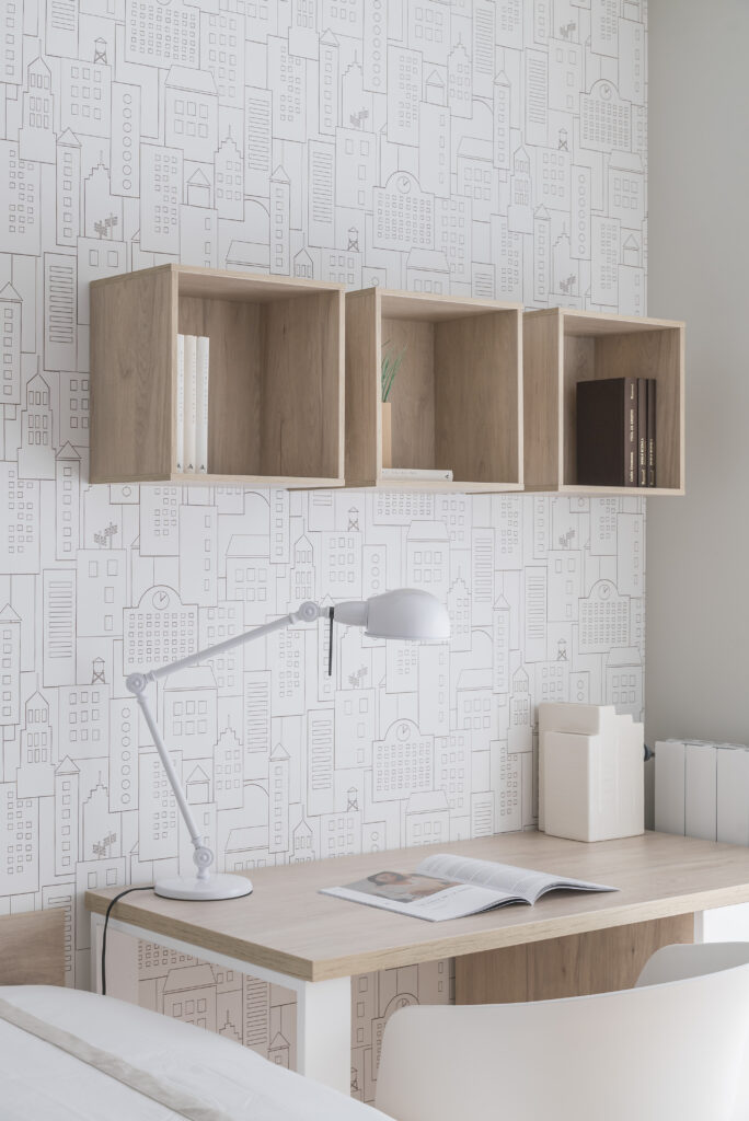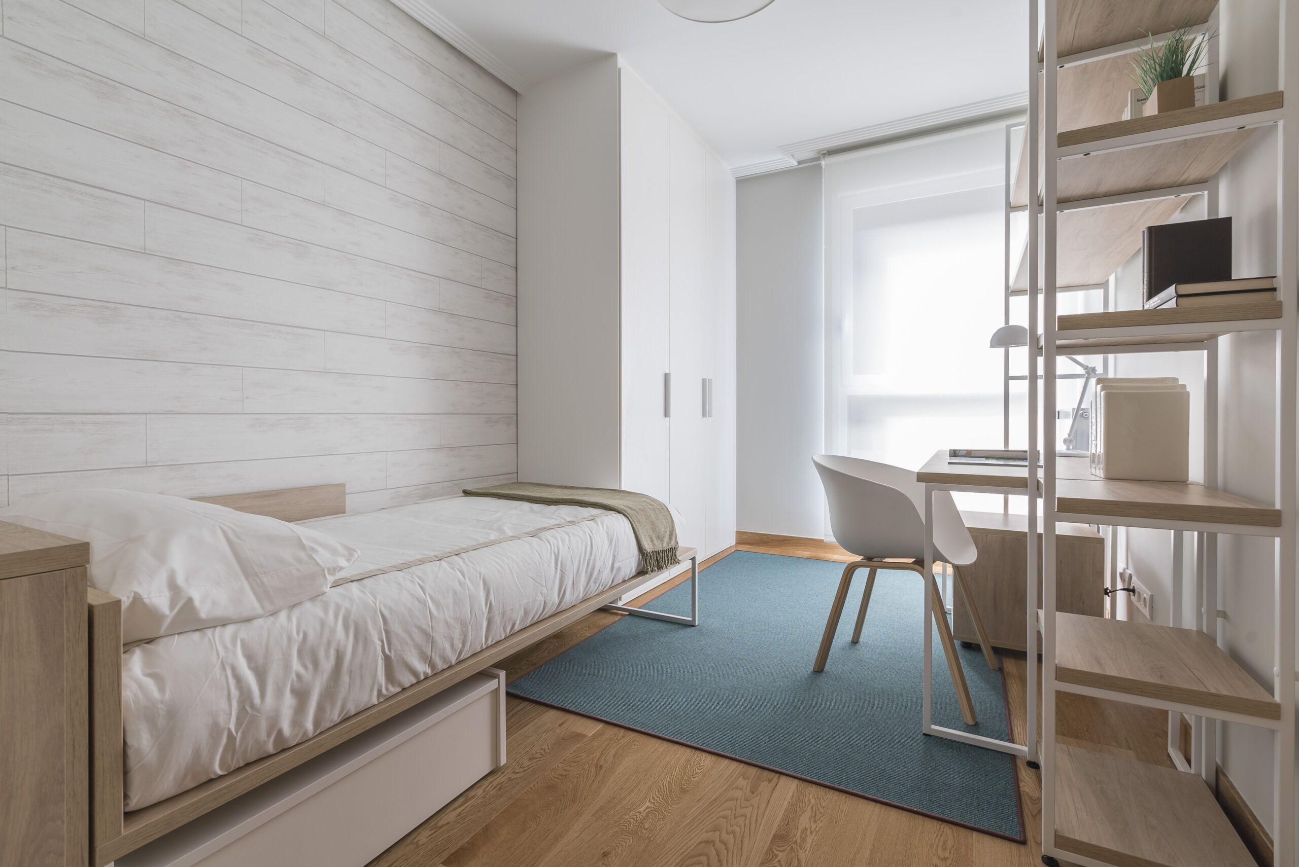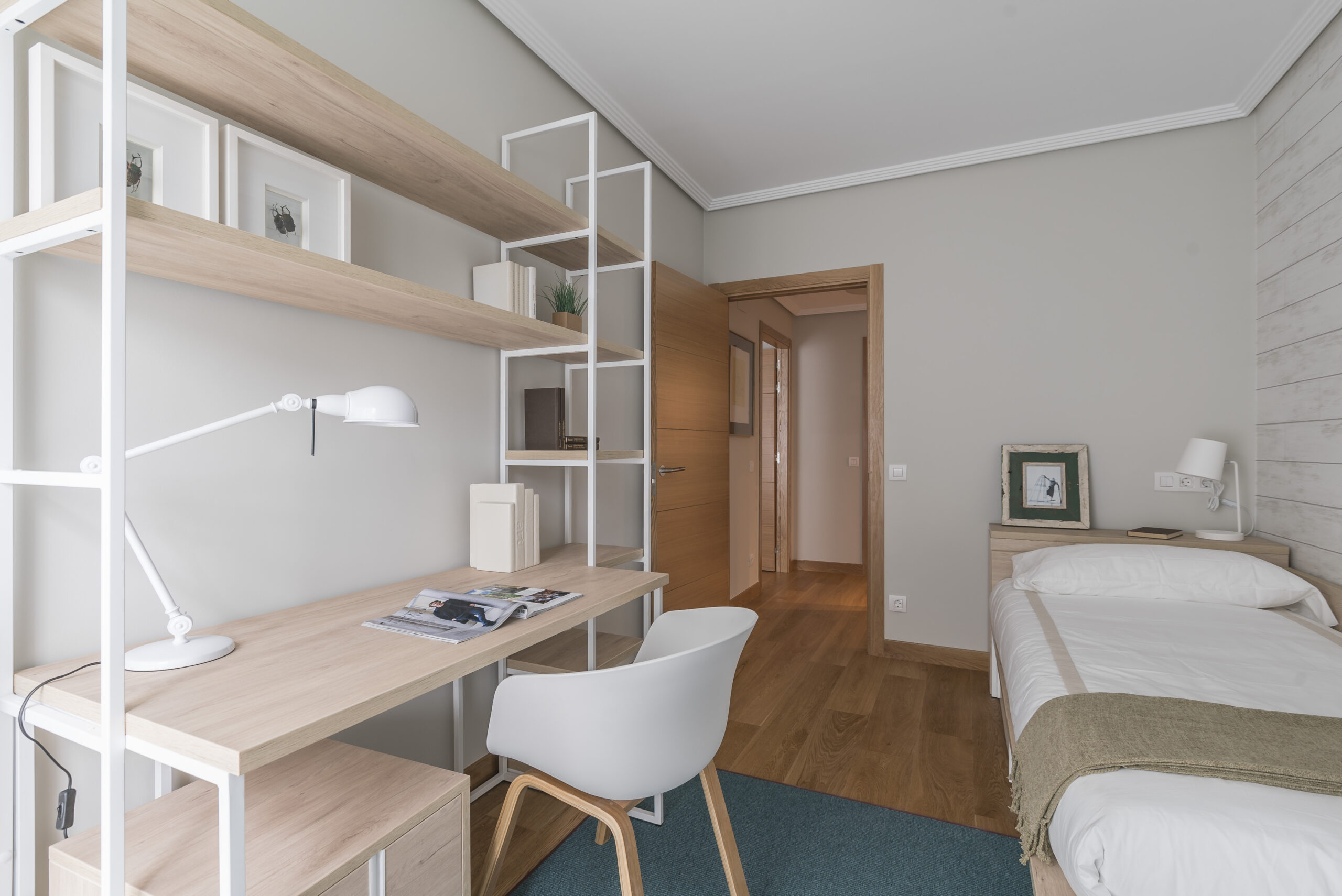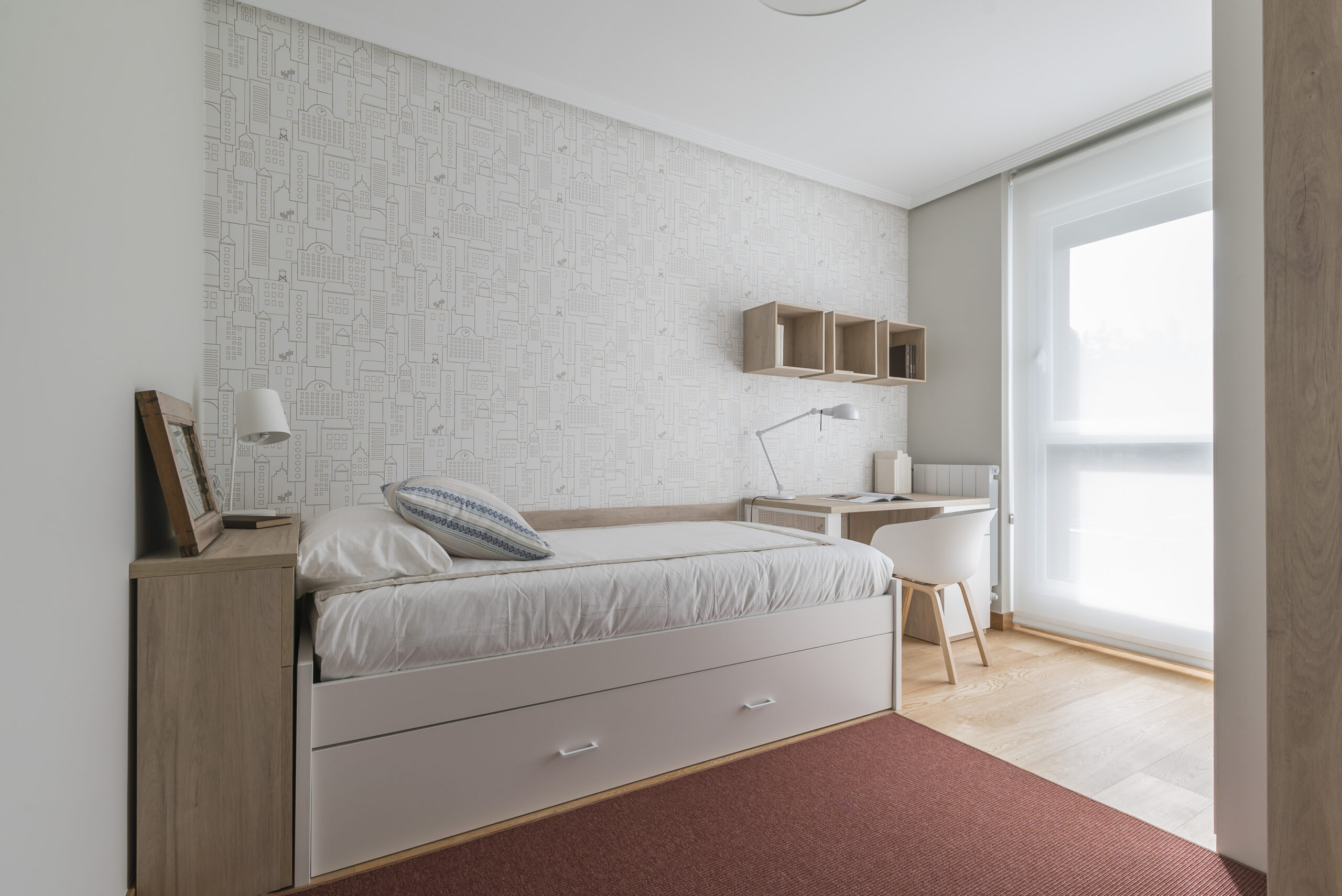 En las habitaciones juveniles también hemos introducido notas de color a través de las alfombras para romper con la frialdad que transmite el color blanco. En uno de los dormitorios hemos optado por un papel pintado de estilo moderno que añade un toque actual a la zona de estudio.
