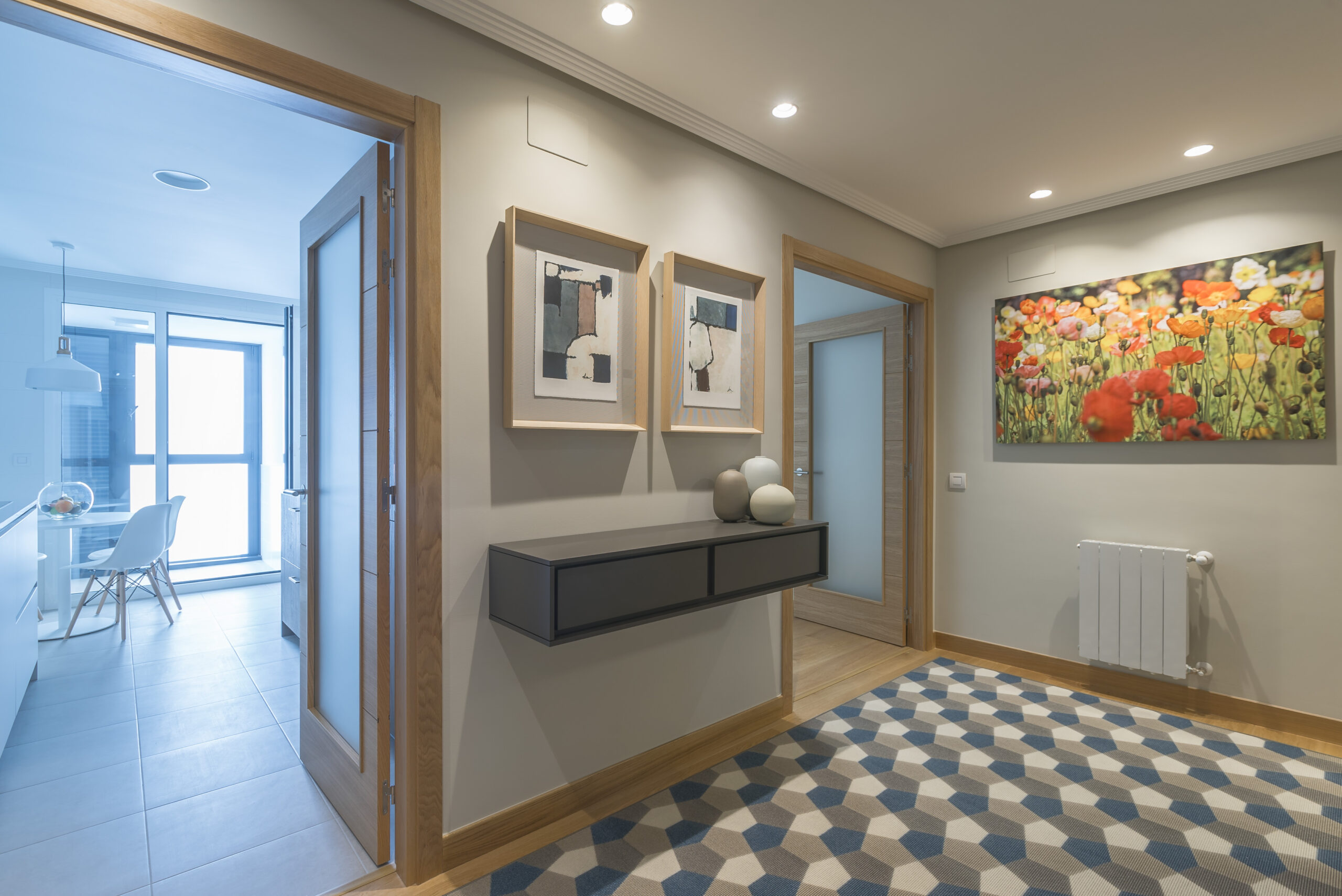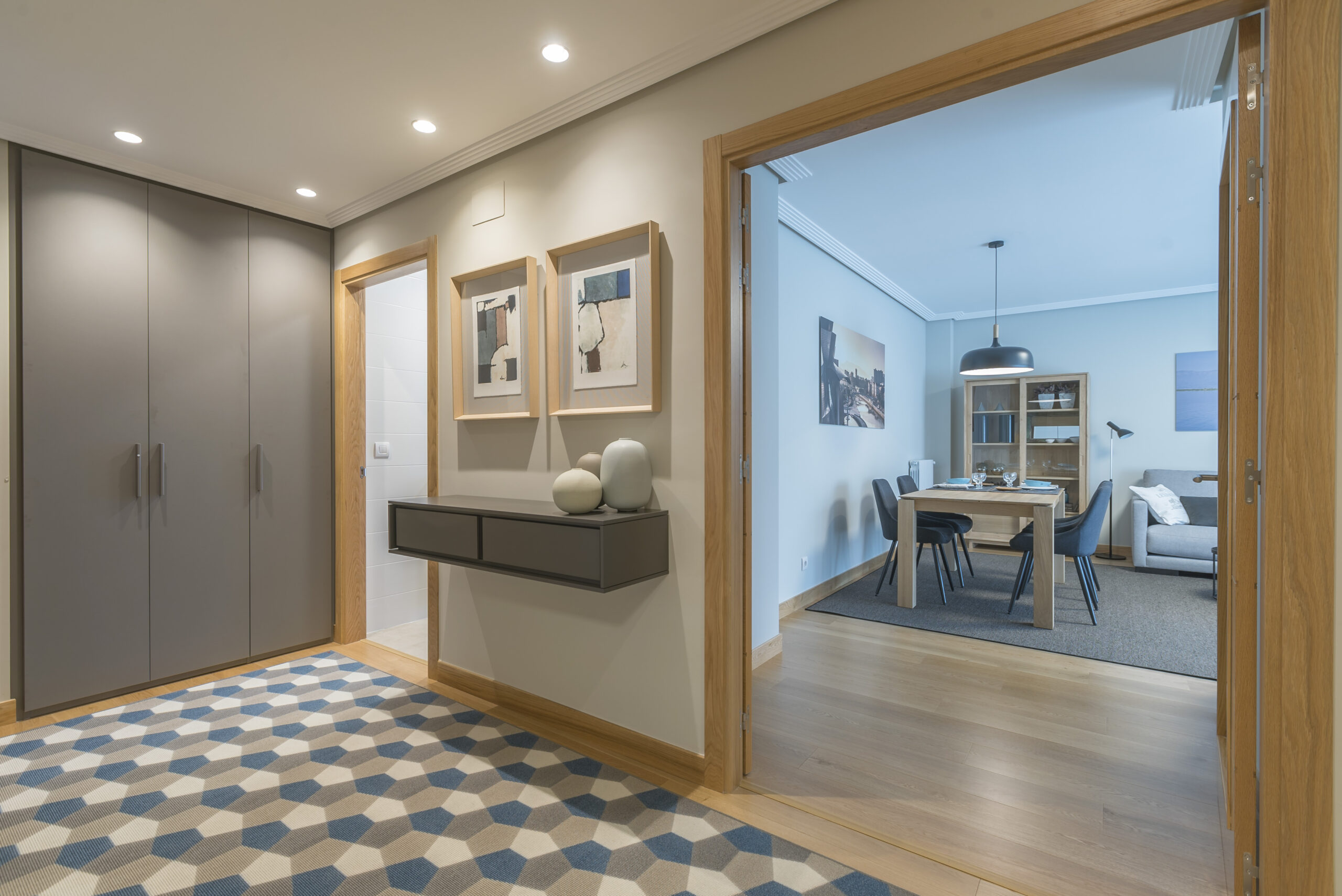 Nuestro recorrido decorativo comienza en el recibidor. Se trata de un espacio amplio donde hemos optado por una consola de pared para aprovechar al máximo los metros disponibles. El toque de color viene a cargo de unos vistosos cuadros y un suelo con motivos geométricos. Además, los propietarios necesitaban espacio de almacenaje, por eso instalamos unos amplios armarios en el recibidor.