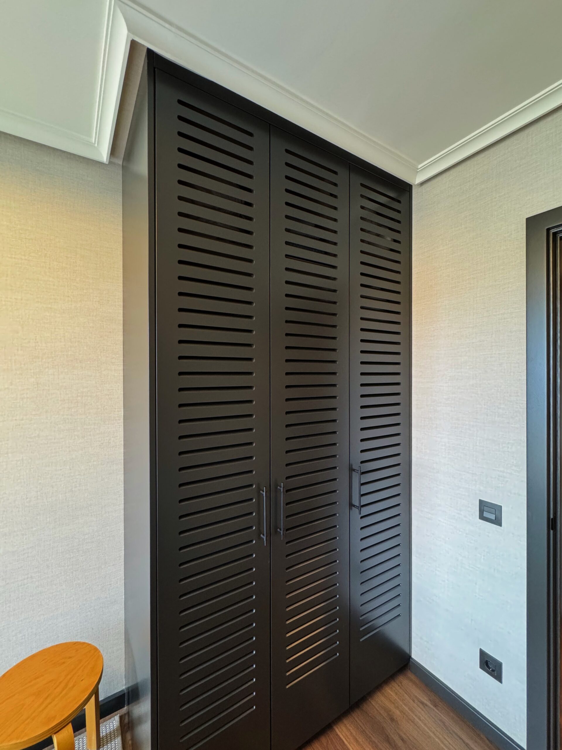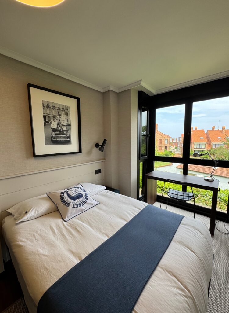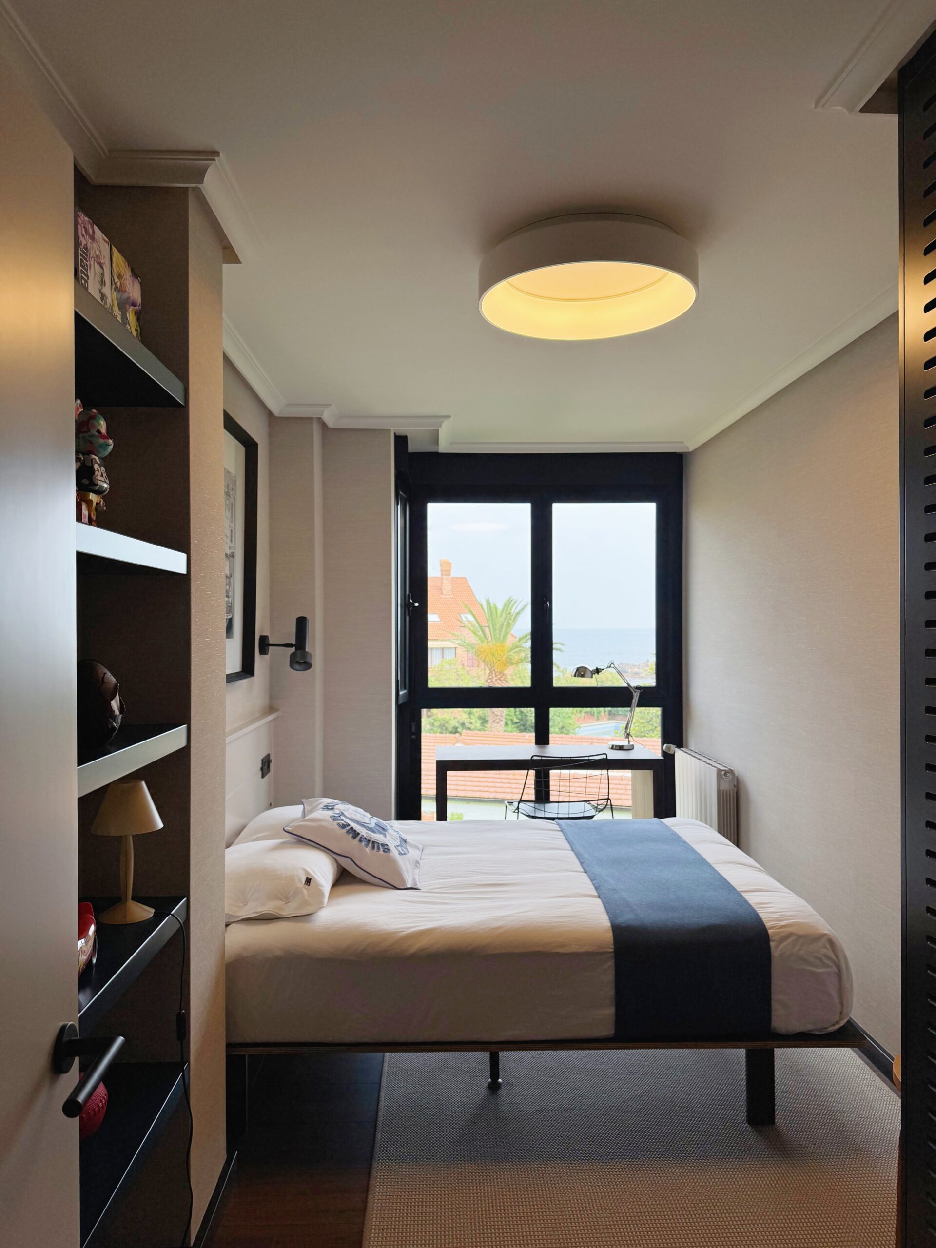 Este dormitorio, orientado al mar, está diseñado para sacar partido a la luz natural y a las vistas. Los armarios, que destacan por sus puertas ranuradas, obra de la firma especializada LANDA EBANISSTERÍA permiten una ventilación constante que evita la humedad en la ropa, algo esencial en zonas costeras.