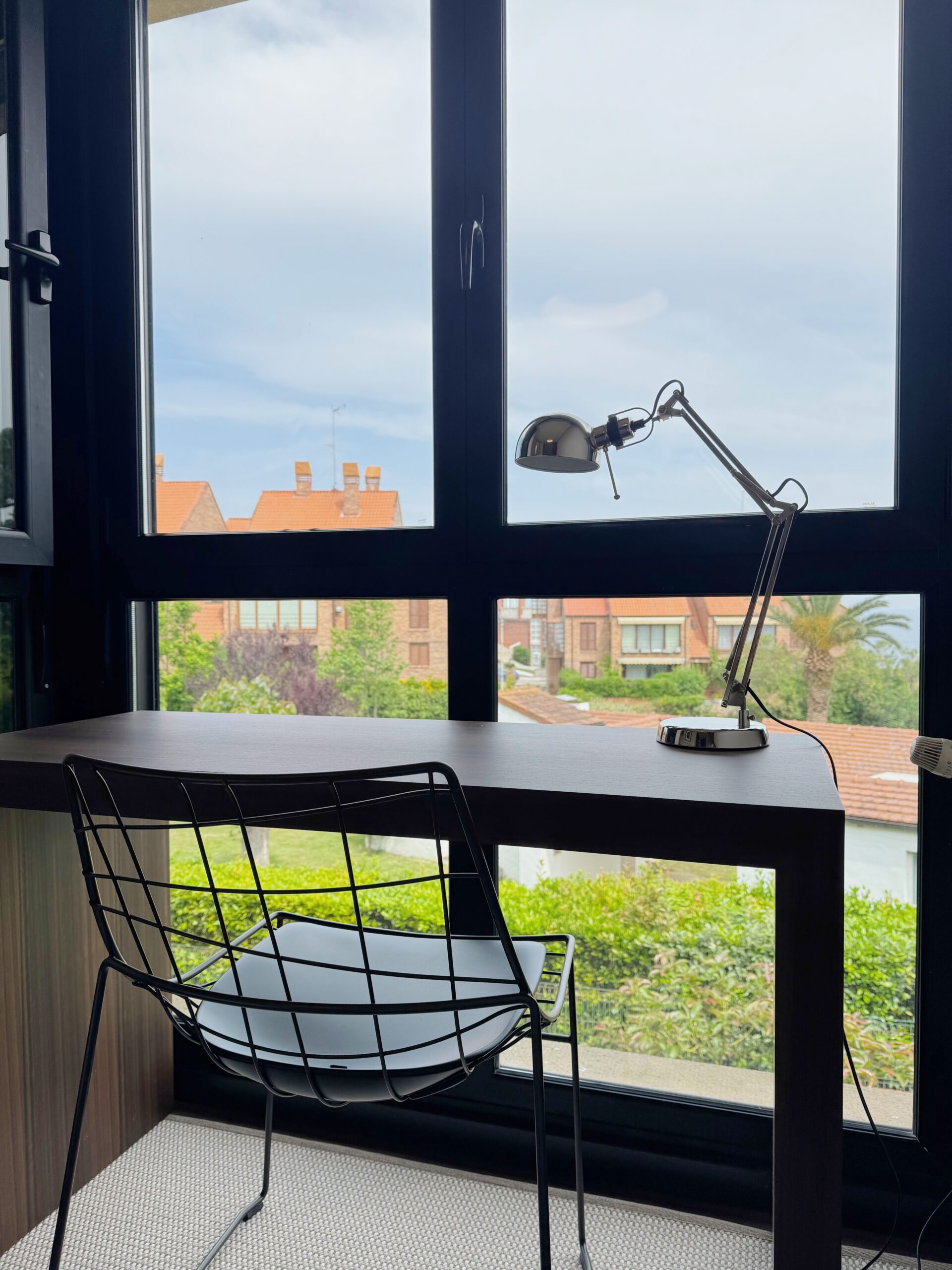 La zona de estudio se sitúa frente a la gran ventana, aprovechando al máximo la luz natural. Una mesa de líneas puras de BESTFORM junto a una silla de estructura metálica conforman un espacio perfecto para el estudio.