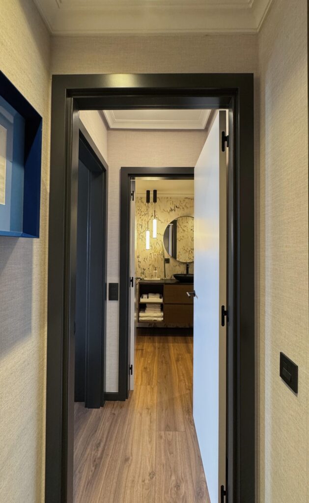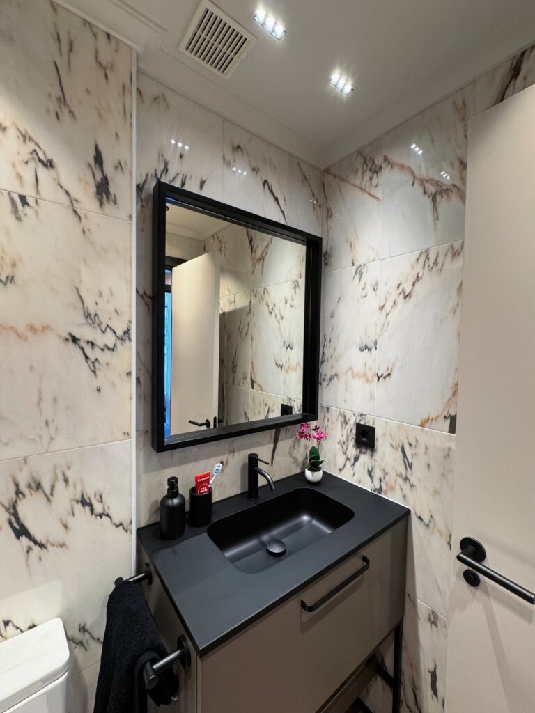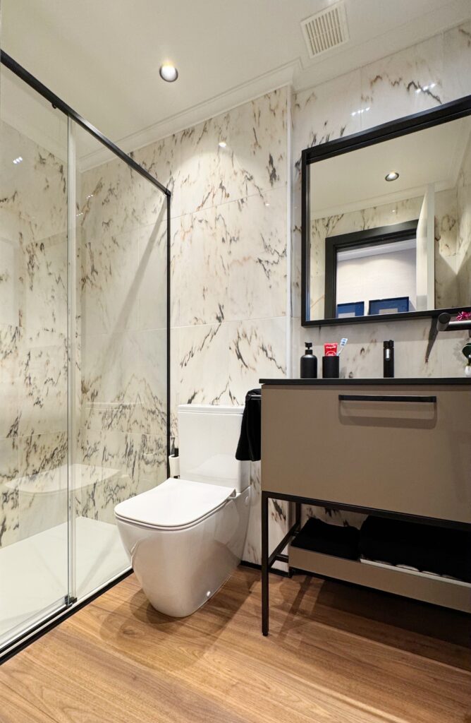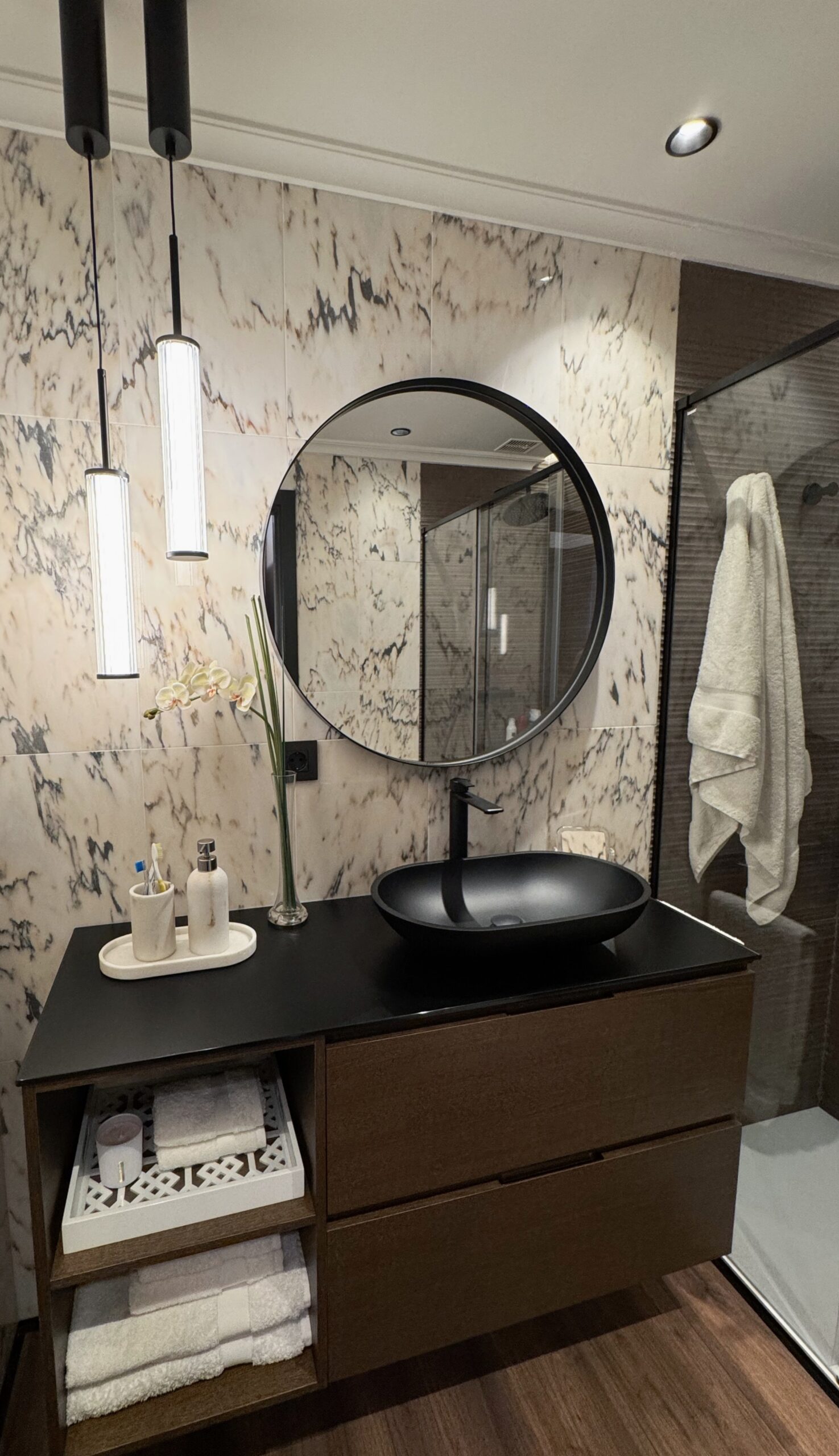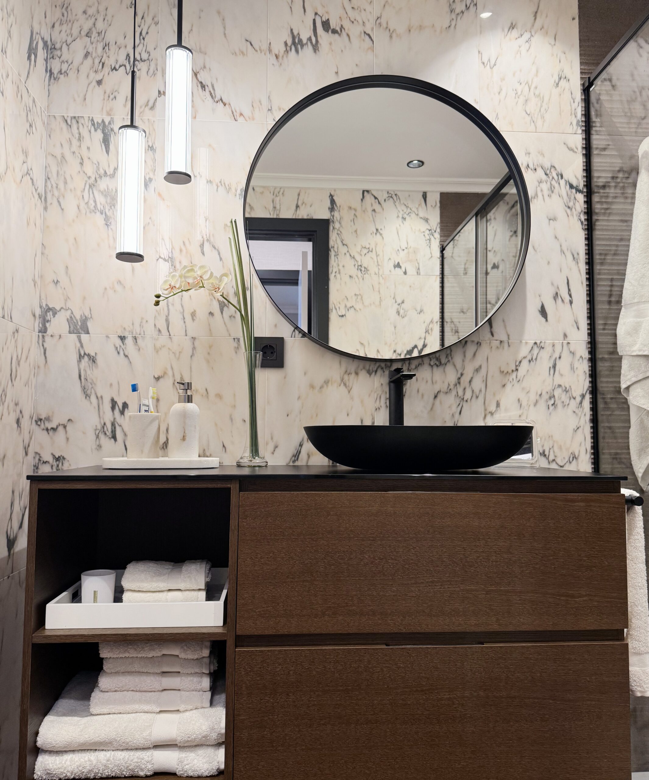 Con acceso directo desde el dormitorio, este baño combina materiales como el mármol, la madera y la grifería negra para dar forma a un espacio elegante y práctico. Las lámparas colgantes no solo iluminan con suavidad, sino que añaden un toque contemporáneo y distintivo. Un ambiente que equilibra diseño y confort, pensado para el uso diario sin renunciar al estilo.