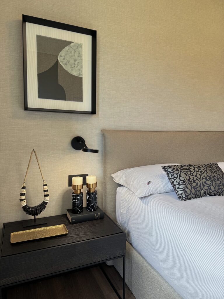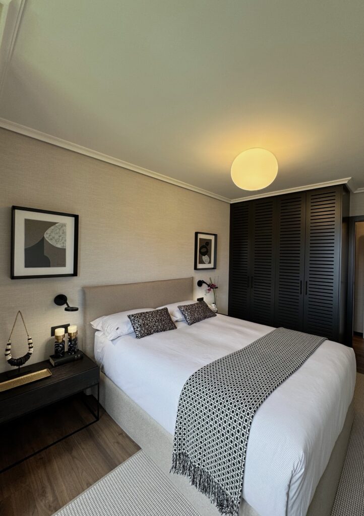 En el dormitorio principal predomina una estética limpia y acogedora. La cama con cabecero tapizado de MANAMA actúa como pieza central. Los detalles, como los cojines y la alfombra de la firma ROLS , aportan textura y confort sin sobrecargar el ambiente. El resultado es una habitación pensada para descansar, con una atmósfera serena y equilibrada.