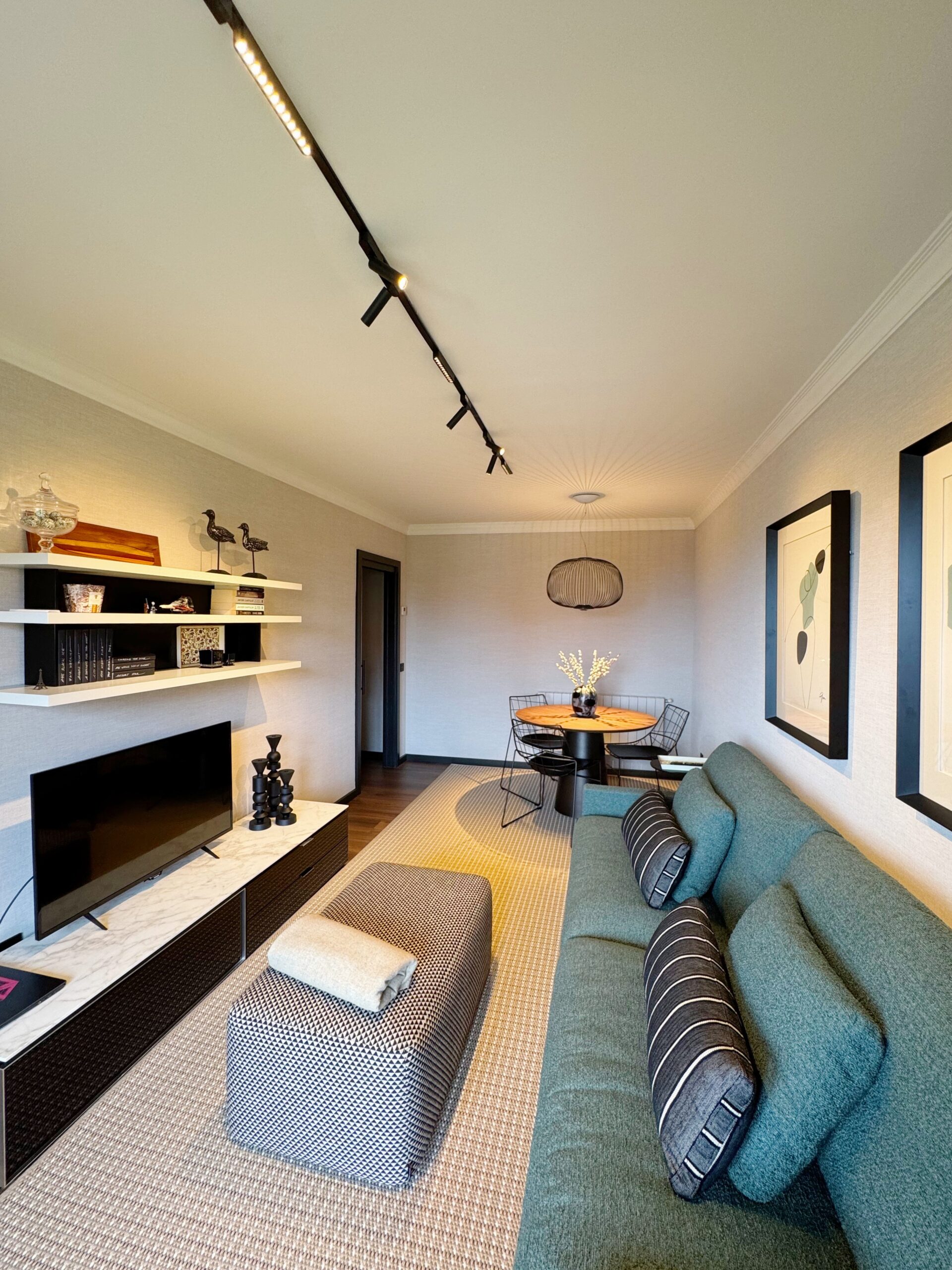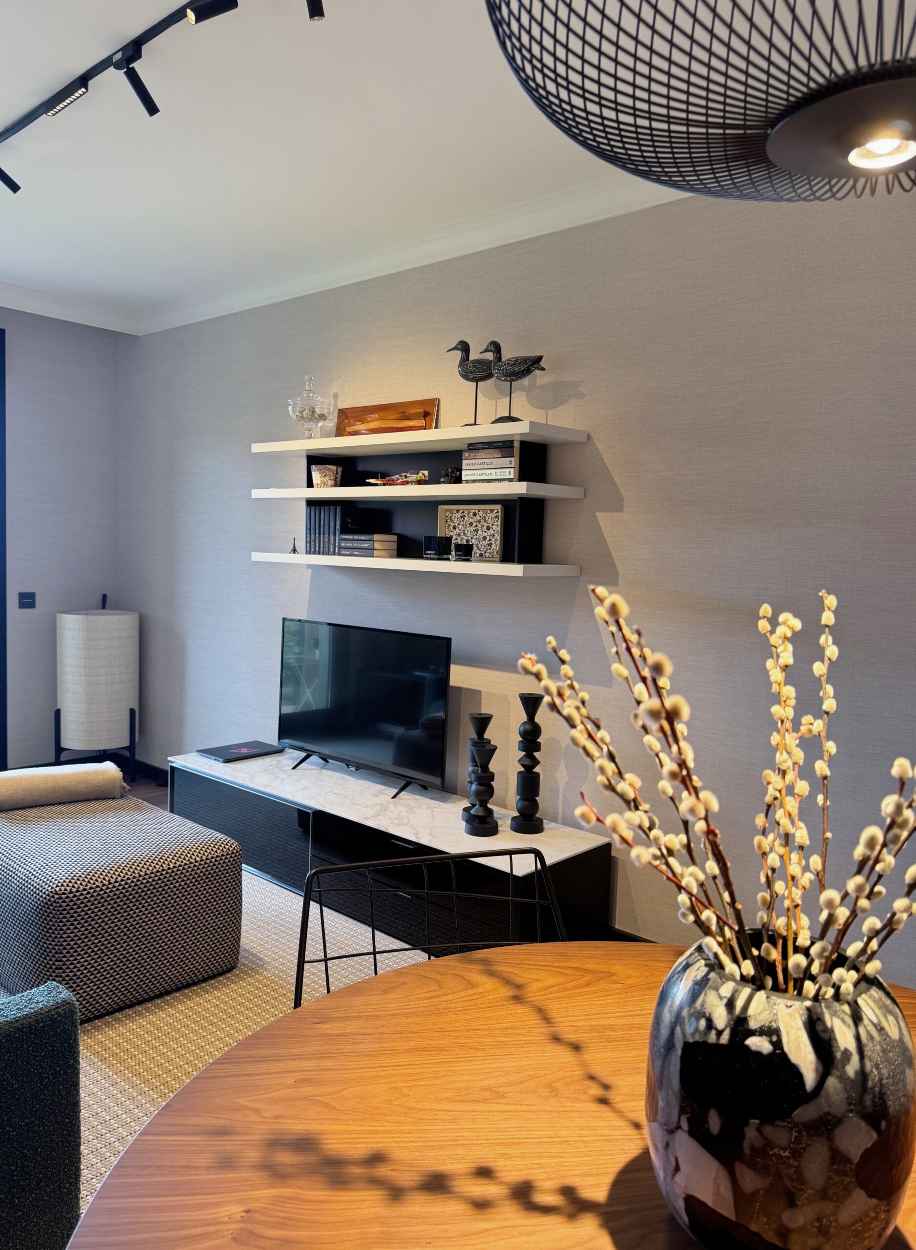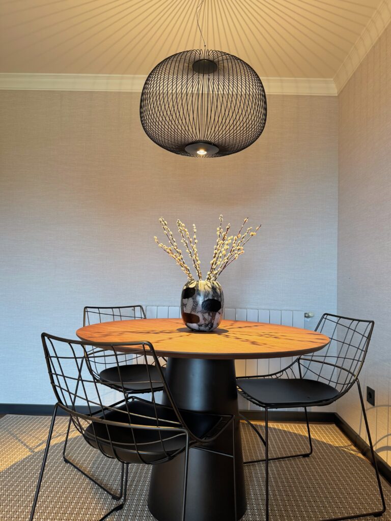 Al acceder a la vivienda, el salón-comedor da la bienvenida con una atmósfera luminosa y bien resuelta. La mesa redonda y sillas de la firma SOVET se sitúan bajo una lámpara colgante de FOSCARINI que marca el punto central del espacio.