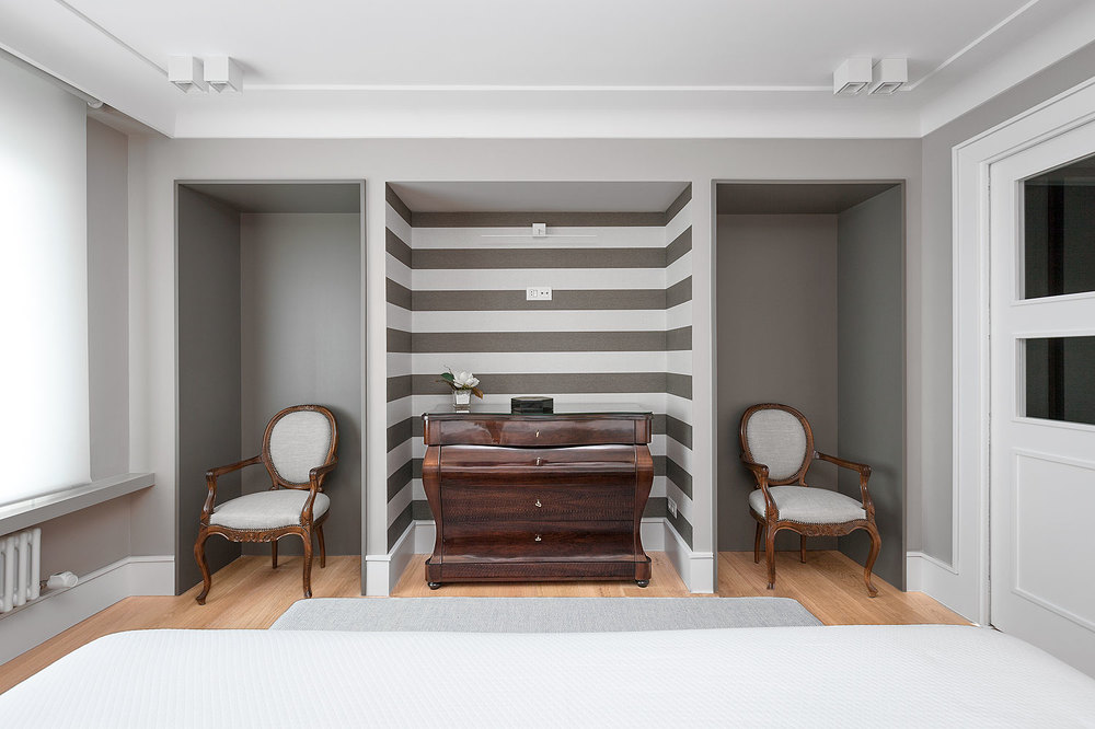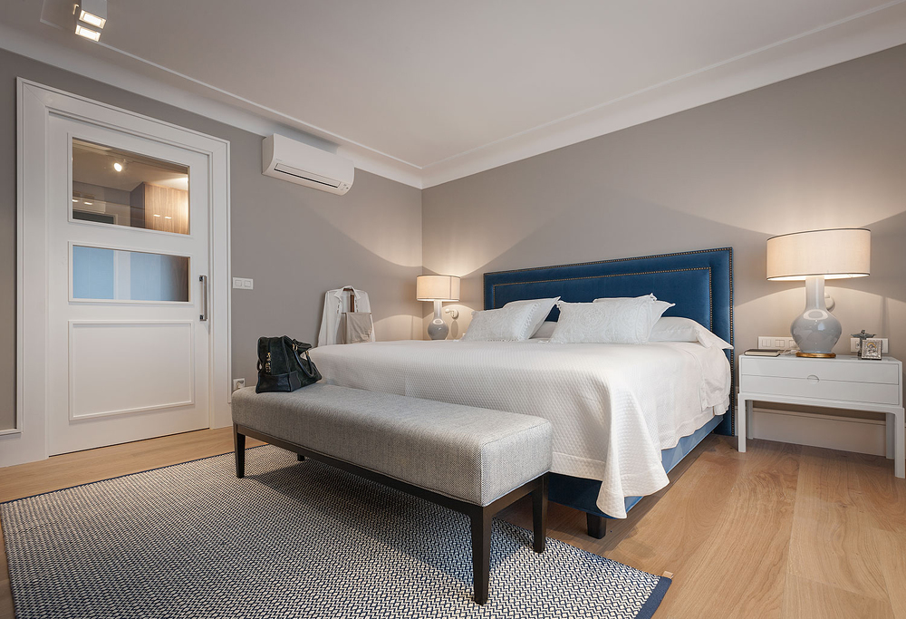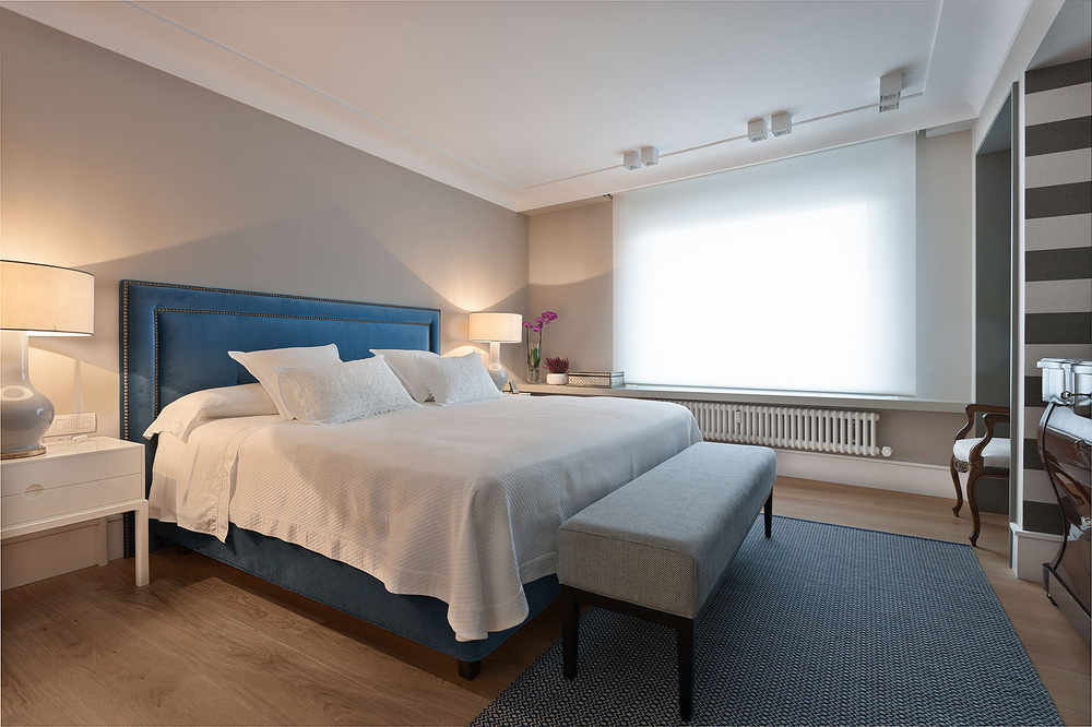 Otro de los grandes atractivos de la decoración de esta vivienda de Getxo (Bizkaia) es el dormitorio principal. Una estancia concebida como una suite. En este dormitorio hemos creado tres estancias contiguas. En la parte central, a través de la cual accedemos, hemos ubicado el vestidor que está flanqueado por unos elegantes y prácticos armarios acabados en nogal y lino.