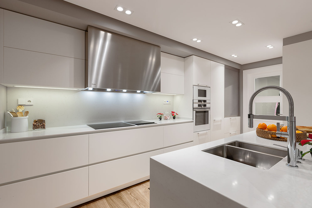 En segundo lugar destacamos un amplio espacio semi abierto que conecta el comedor con la cocina. El objetivo de esta reforma era delimitar ambos ambientes, sin perder luminosidad y continuidad visual, y sin tener que renunciar a la privacidad de una cocina independiente.