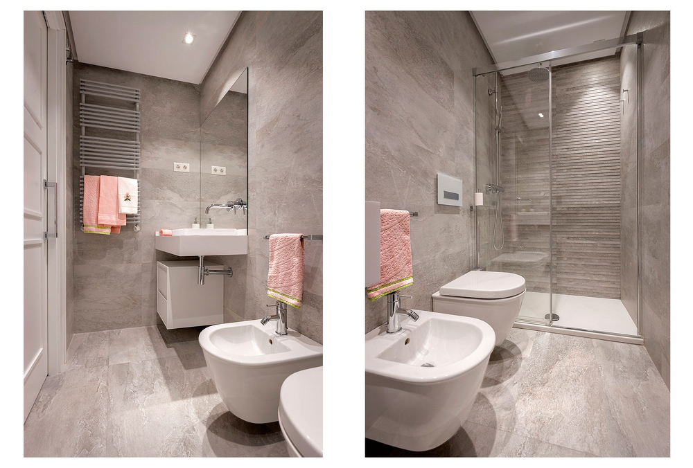 Después del vestidor accedemos, por un lado, al dormitorio y, por el otro, a un amplio baño doble. Esta distribución ha sido concebida para que puedan utilizarse todas las estancias sin molestar a la persona que está descansando.