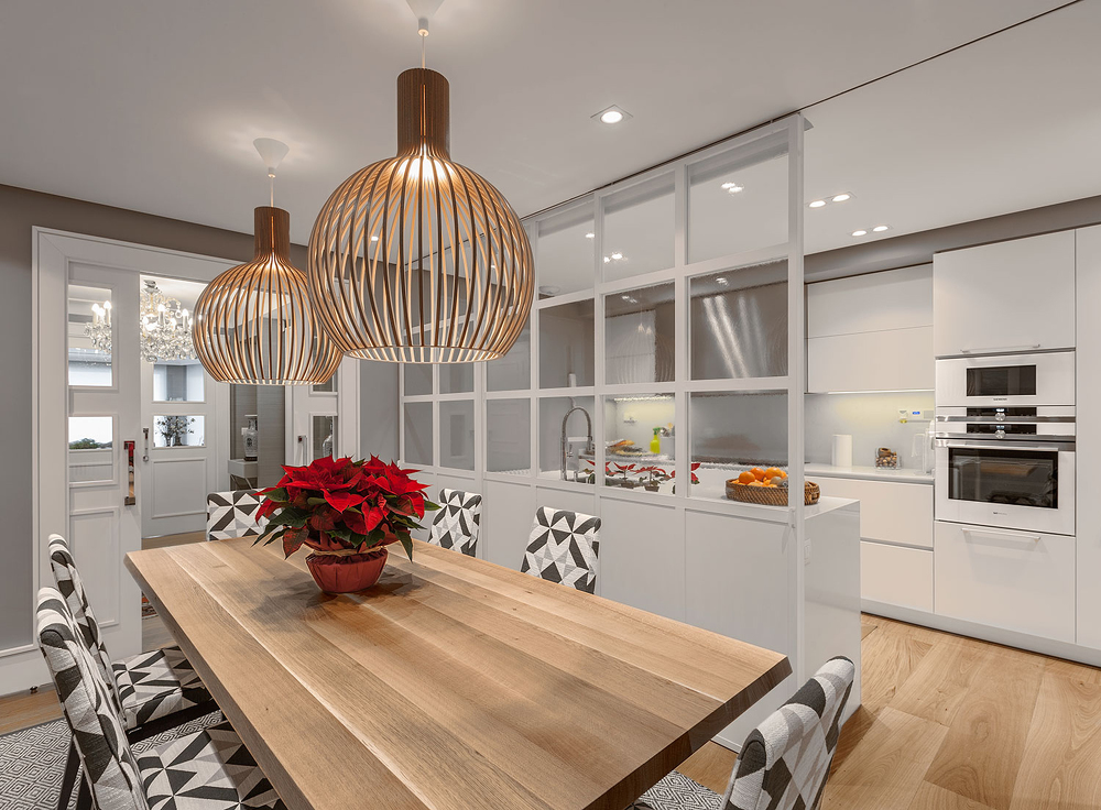 Estos ambientes, la cocina y el comedor, están comunicados mediante una estructura de herrería lacada en blanco y provista de puertas correderas a cada lado. De esta forma, un elegante comedor de diario da paso a una cocina luminosa y muy funcional.