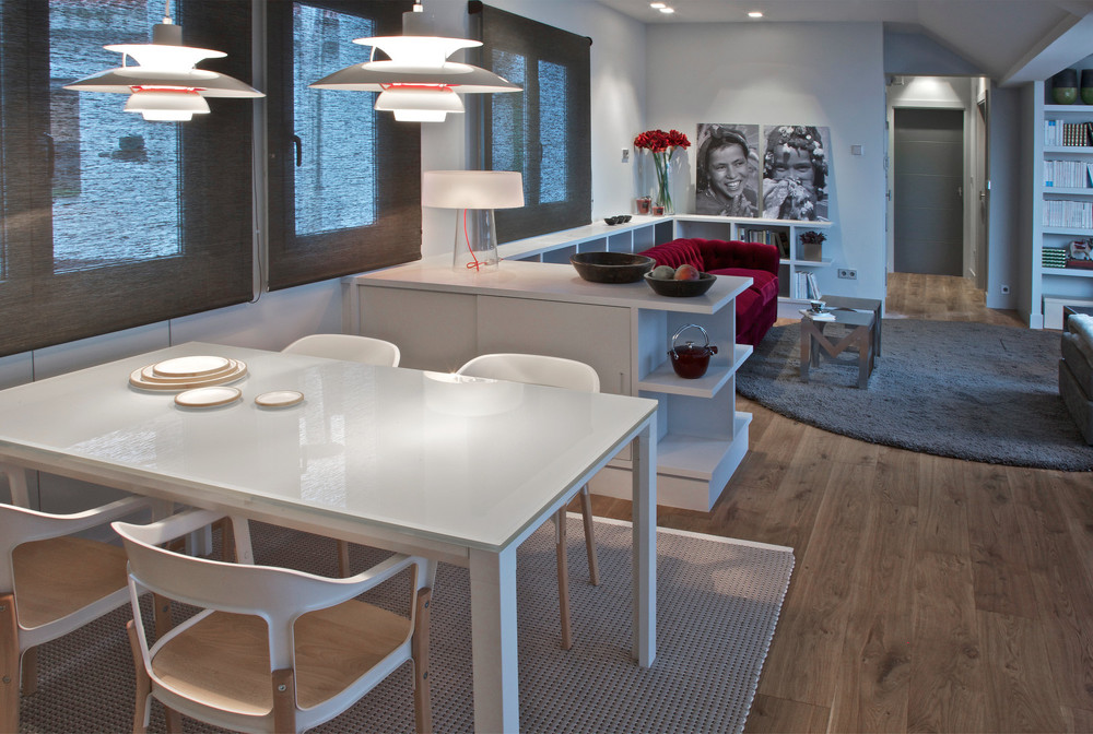 Otro detalle decorativo importante es el color. Para ganar luminosidad hemos optado por un mueble de color blanco que combina con la mesa y las sillas del comedor. De esta forma, ambos espacios quedan perfectamente integrados, manteniendo así una coherencia estética en toda la decoración de esta vivienda tipo loft de Bilbao. El toque acogedor lo hemos conseguido con un suelo en madera noble que aporta calidez y añade carácter al espacio.
