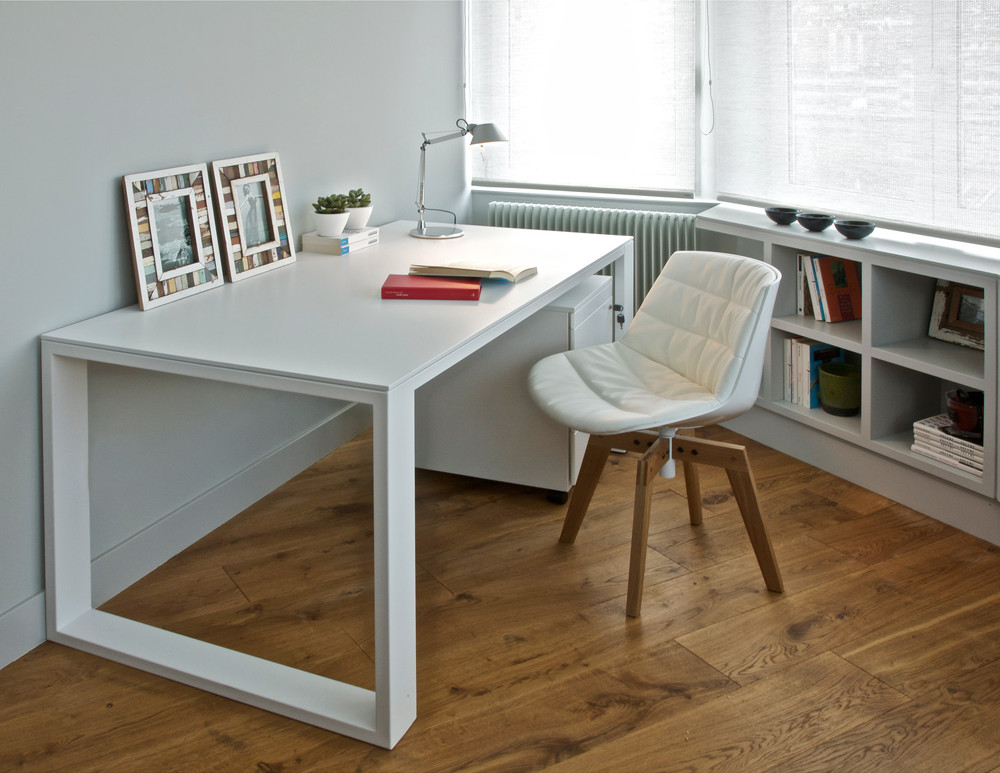 En la reforma y decoración de este loft de Bizkaia también hemos diseñado una pequeña zona de trabajo, con muebles en color blanco, que combinan con el comedor y el salón, sirviendo así de unión entre cada uno de los espacios. En esta práctica zona de trabajo hemos optado por una estantería baja, que permite el paso de la luz a través de los amplios ventanales. De nuevo, la elección del blanco nos ayuda a potenciar la luz natural y ganar amplitud.