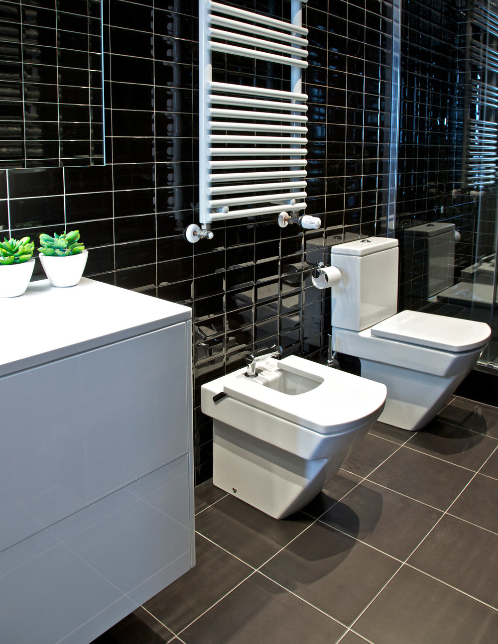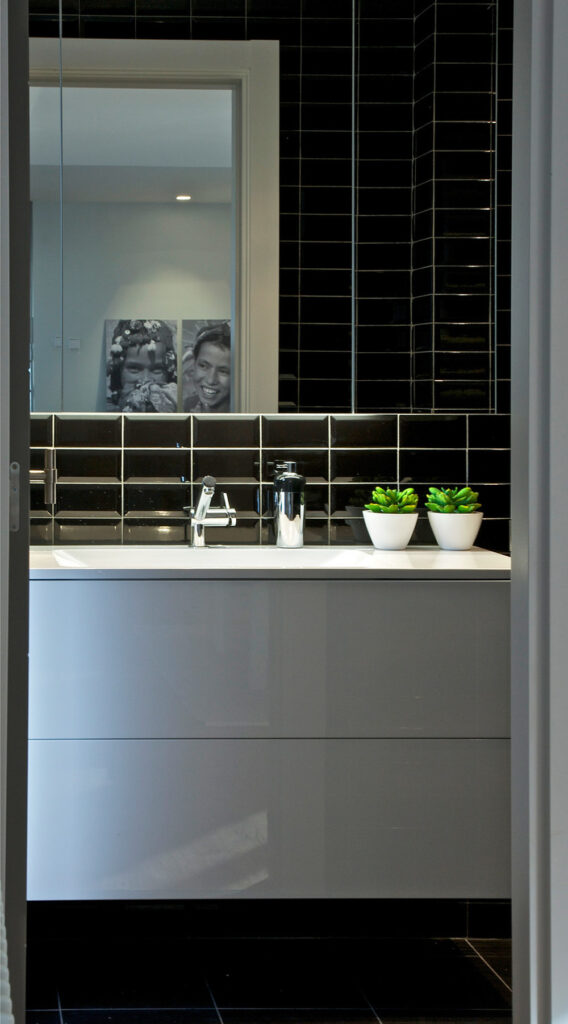 El cuarto de baño es un espacio separado del resto de la vivienda. Para decorar este pequeño oasis urbano nos hemos decantado por unas baldosas en color oscuro que aportan mucha personalidad y crean contrastes frente al blanco de los muebles de lavabo.