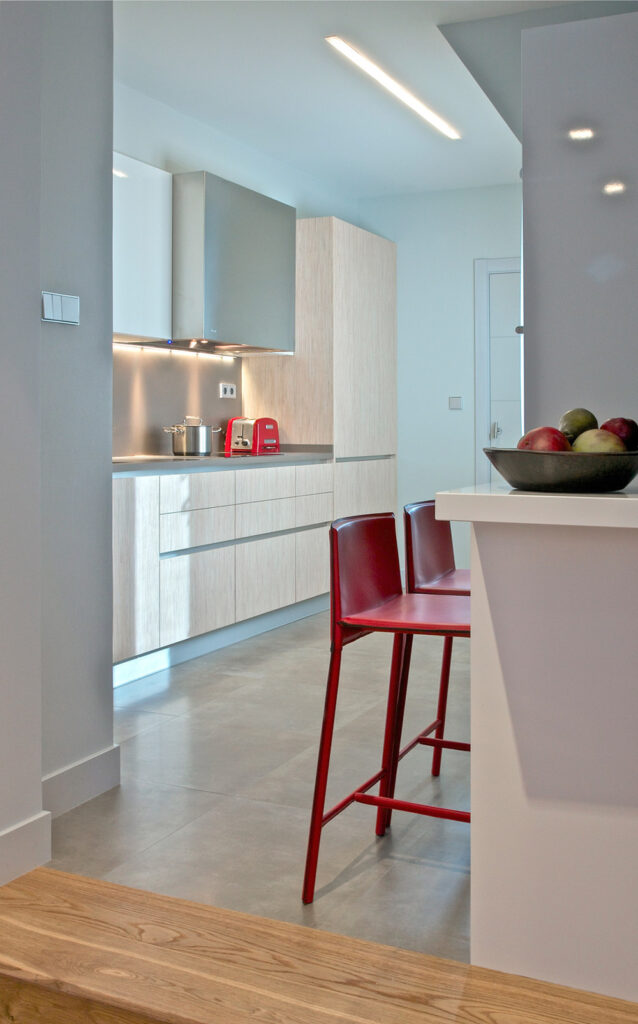 La zona del comedor nos conduce a una cocina amplia y luminosa. Para delimitar este espacio, hemos instalado una barra americana de desayuno con dos taburetes de color rojo que ponen el toque decorativo y crean contrastes. Mientras que para los muebles de la cocina, hemos optado por diseños en madera clara que potencian la luz natural. Otro detalle que nos ayuda a separar la cocina del resto de espacios de este loft es el suelo. En la cocina hemos escogido una elegante baldosa en tonos claros que combina a la perfección con los muebles en madera.