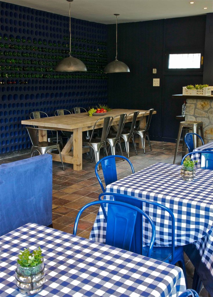 Para romper con la neutralidad de los materiales naturales, introdujimos detalles en color azul en sofás y sillas, aportando vitalidad y frescura sin perder la esencia del estilo rústico. Esta paleta cromática crea contraste y refuerza el carácter acogedor del espacio.