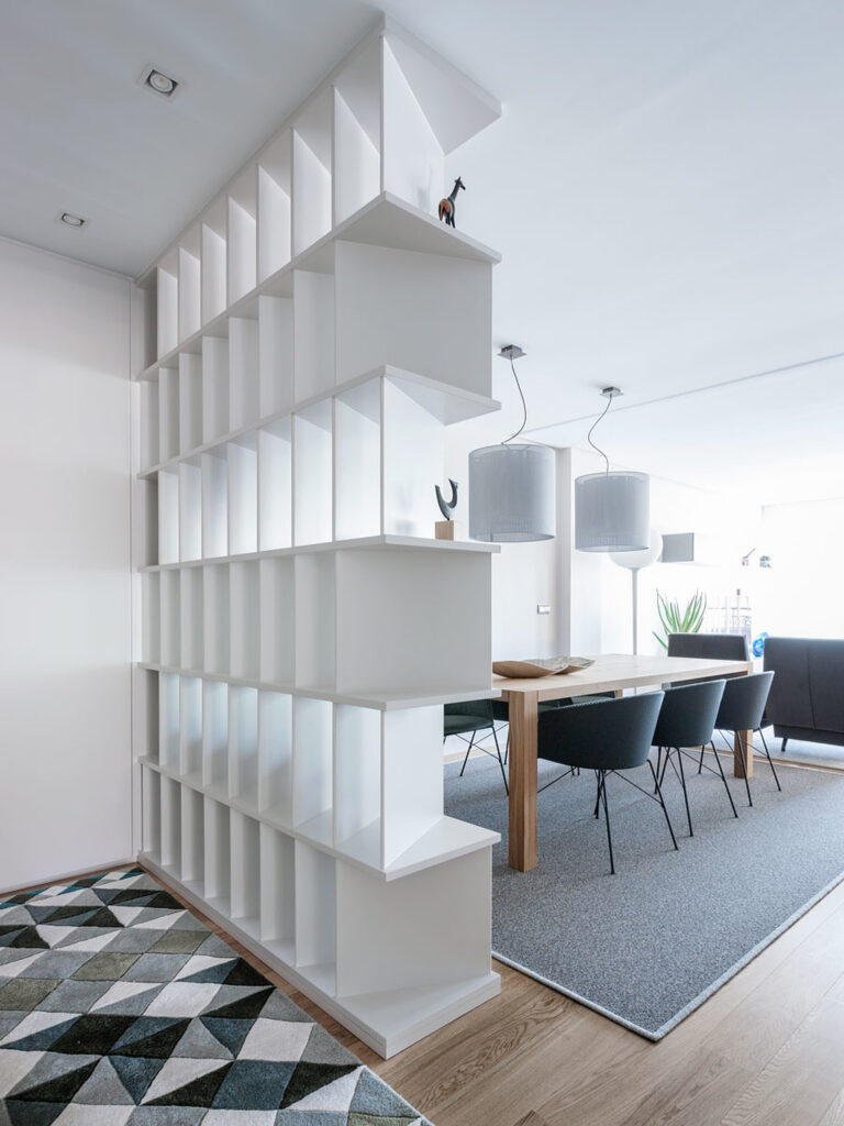 Para delimitar y ganar calidez en los distintos ambientes hemos optado por vestir el suelo con alfombras que añaden confort y enmarcan cada espacio. Mientras que en la zona del comedor formal hemos optado por una estantería abierta para separar este ambiente, sin perder luminosidad y continuidad visual.