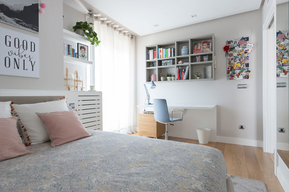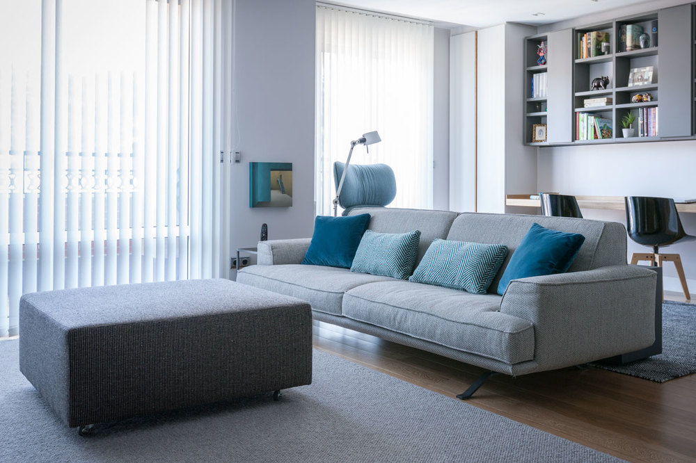 Uno de los espacios más importantes de la decoración de esta vivienda en el centro de Bilbao es el increíble salón, donde también hemos creado un pequeño rincón de trabajo junto a la pared. Las cortinas verticales permiten regular el paso de la luz natural y los detalles en azul combinan de maravilla con una base decorativa en gris y blanco.