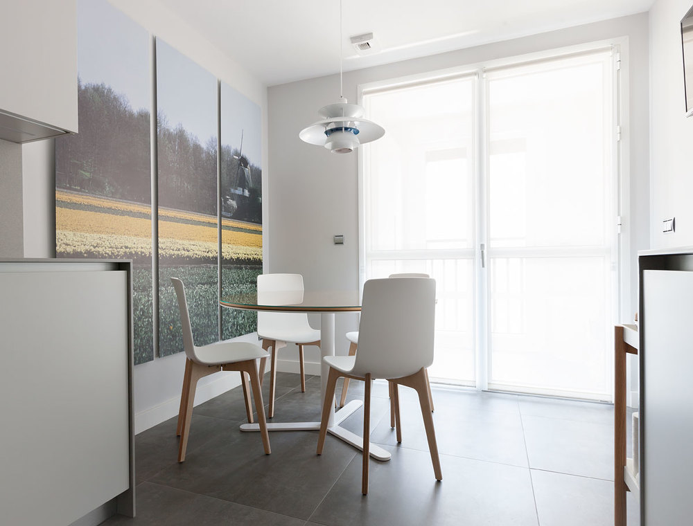 Por otra parte, en la cocina también hemos creado una zona de comedor de diario junto a un amplio ventanal que ilumina este encantador rincón. Para la decoración de la cocina hemos optado por una paleta de color en blanco y madera clara que ayuda a ganar calidez. El toque de color lo conseguimos con un inspirador cuadro tríptico.