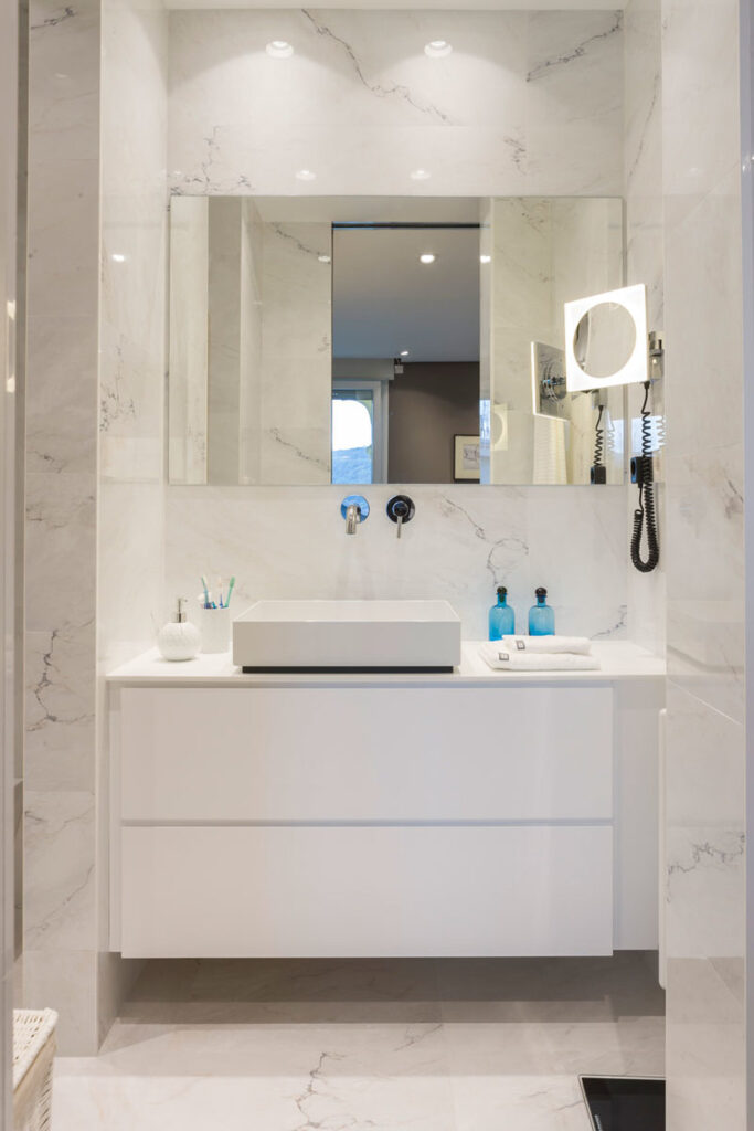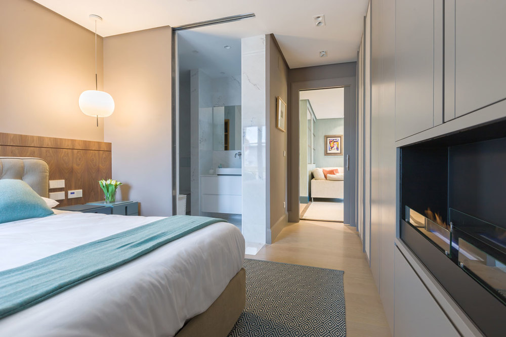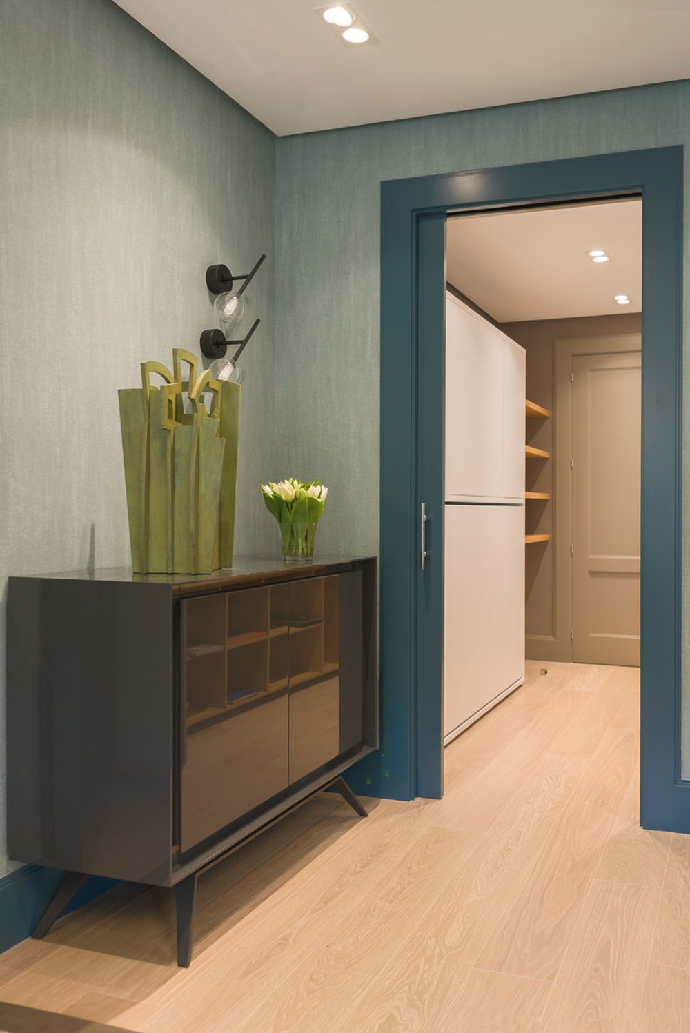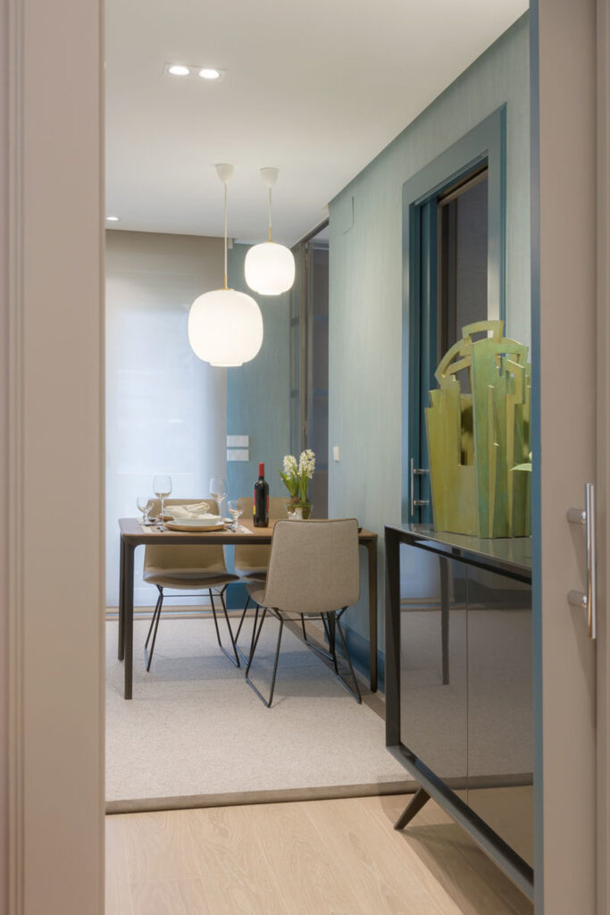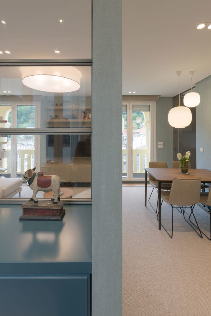 Otros aspectos importantes han sido la paleta de colores y la arquitectura del edificio. En este sentido, decidimos hacer un guiño a la ubicación del inmueble y añadir detalles en azul. Por eso optamos por colores que van desde un azul claro hasta un verde agua. Además, combinamos estos tonos con los materiales, como la cálida madera y el elegante mármol. Como resultado, la decoración de esta vivienda de Donostia, San Sebastián, se ha transformado por completo, fusionando el interior con el exterior.