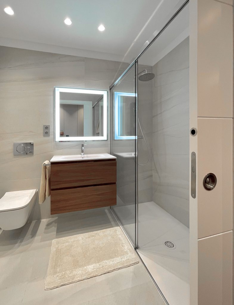 Por último cabe destacar el diseño de los cuartos de baño que se encuentra en armonía con el resto de la decoración. También hemos sacado partido a los pasillos y las zonas de paso para conseguir almacenamiento extra con armarios integrados. Este ha sido, sin duda, uno de los aspectos más importantes del proyecto de interiorismo de esta vivienda de Bilbao.