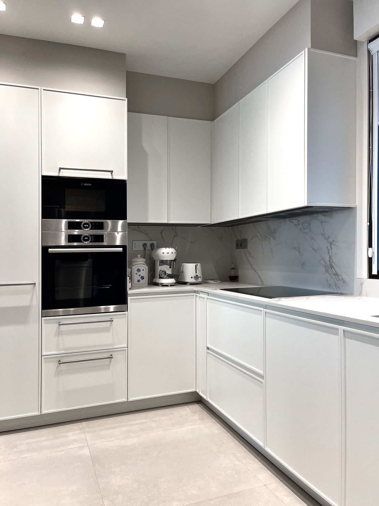 Mientras que en la cocina hemos optado por un cerramiento de cristal para separar este espacio del salón-comedor, sin perder luz y fluidez. La cocina, de la firma DOCA, destaca por la amplitud y la luminosidad de su decoración en blanco. Un color que está presente tanto en los muebles como en la encimera de mármol.