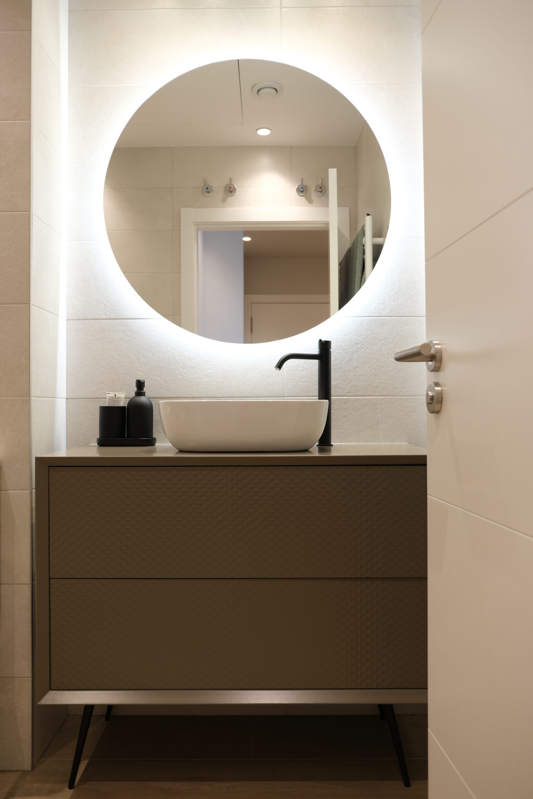 Por último, cabe destacar que el baño tiene como protagonista un mueble de estilo retro. Un diseño con frontal en relieve de punta de diamante que sigue la estética retro del resto de la vivienda.