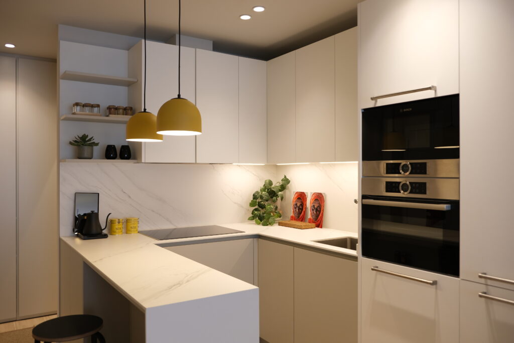El siguiente espacio al que accedemos es la cocina, de la firma especializada DOCA. Una cocina abierta y con barra americana que queda totalmente integrada en la vivienda. De esta forma hemos logrado dar cierta continuidad a los distintos espacios, conectando la cocina con el comedor y el salón. Además, la península de la cocina enmarca el espacio y es perfecta como zona de desayuno.