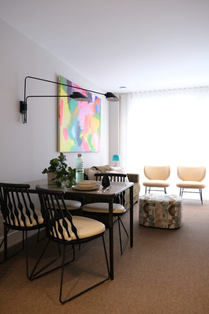 El siguiente ambiente es la zona de salón-comedor, que está amueblada con piezas de diseño. En este espacio, nuestros interioristas y decoradores escogieron la mesa de comedor modelo SLIM de la firma SOVET, las sillas NUB de PATRICIA URQUIOLA y la estantería Randomissimo de MDF.