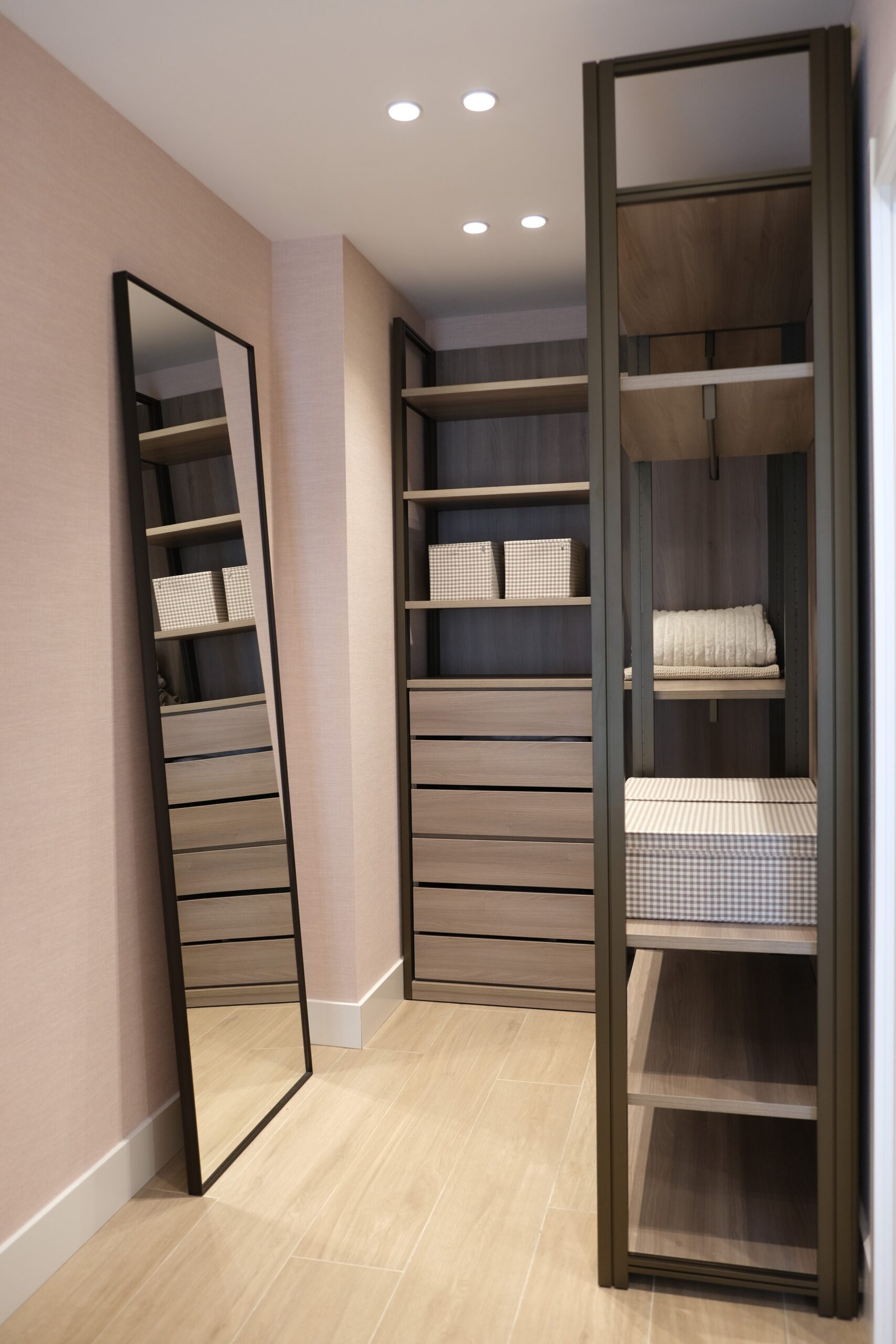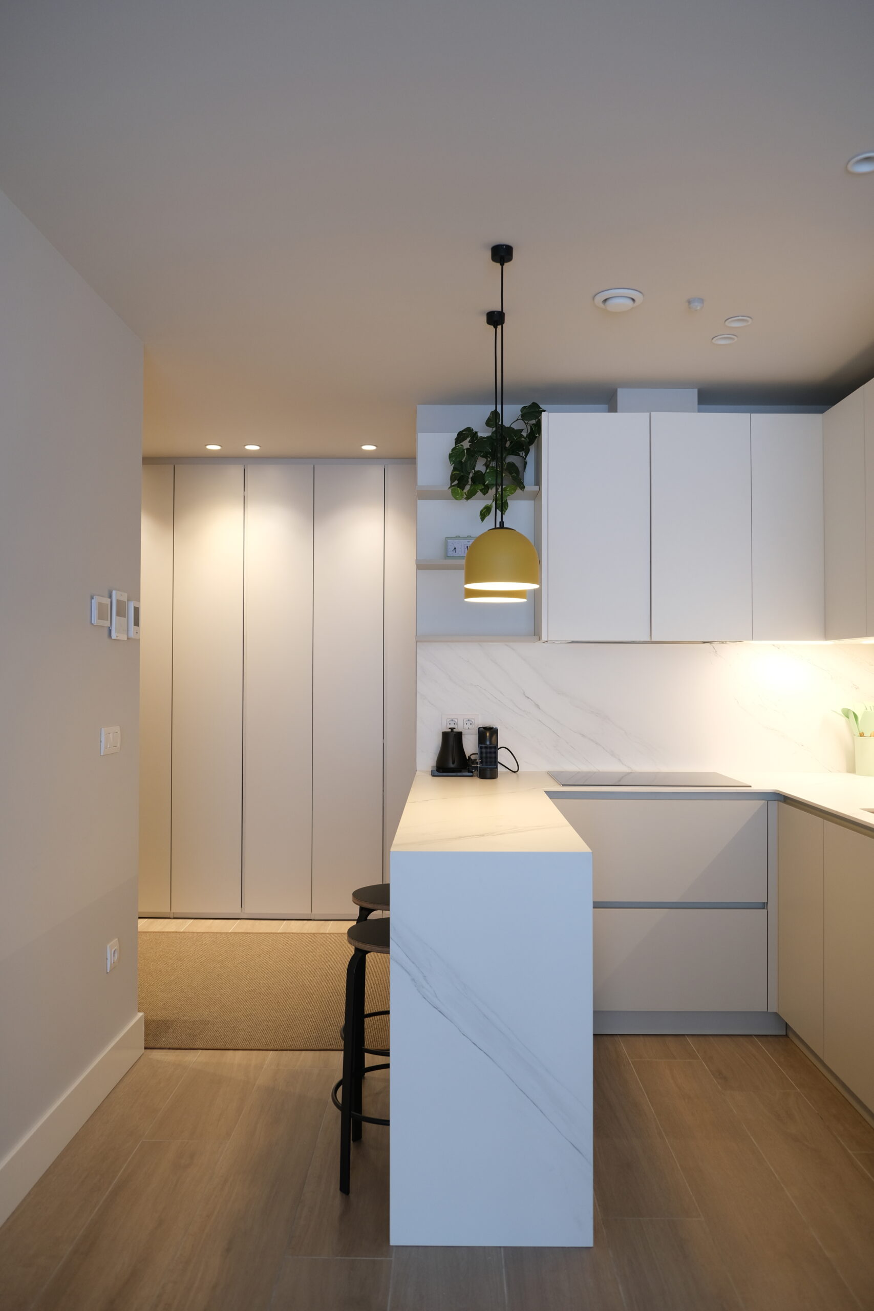Uno de nuestros principales objetivos era conseguir almacenaje suficiente. Por eso creamos en la entrada de la vivienda un armario gabanero de la firma MIDI, que se diseñó a medida. En este espacio integramos también la zona de lavandería.