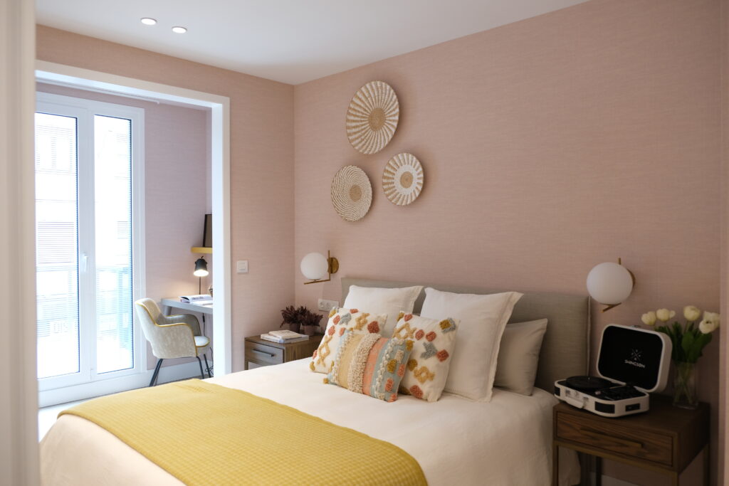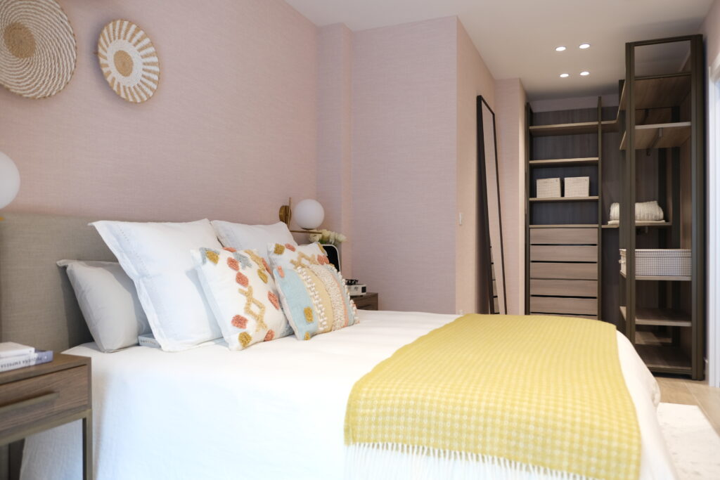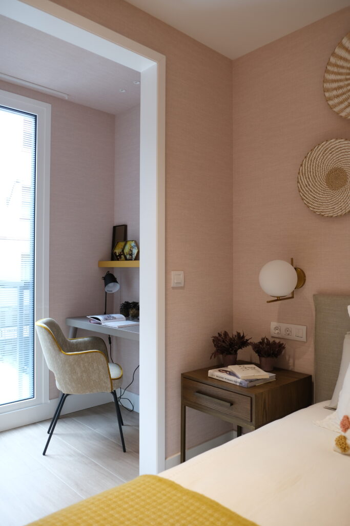 El color que predomina en el dormitorio es el rosa empolvado que se combinó con pinceladas de mostaza dando al espacio luz y un estilo desenfadado y juvenil.