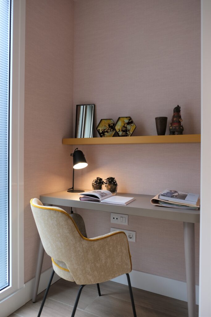 En esta habitación también hemos creado una encantadora zona de trabajo, situada junto a una puerta de exterior para recibir suficiente luz natural. En cuanto al espacio de almacenaje, en lugar de armarios, optamos por instalar un vestidor abierto de la firma MIDI. La cama es el modelo Jersey de la firma CASADESUS.