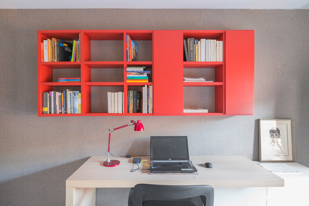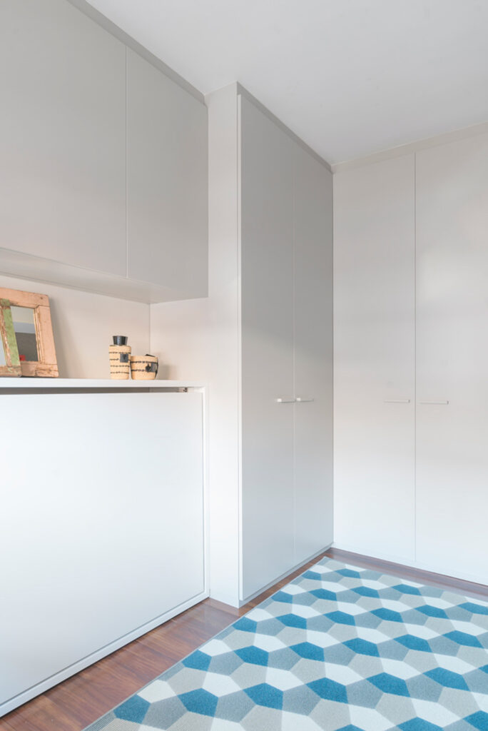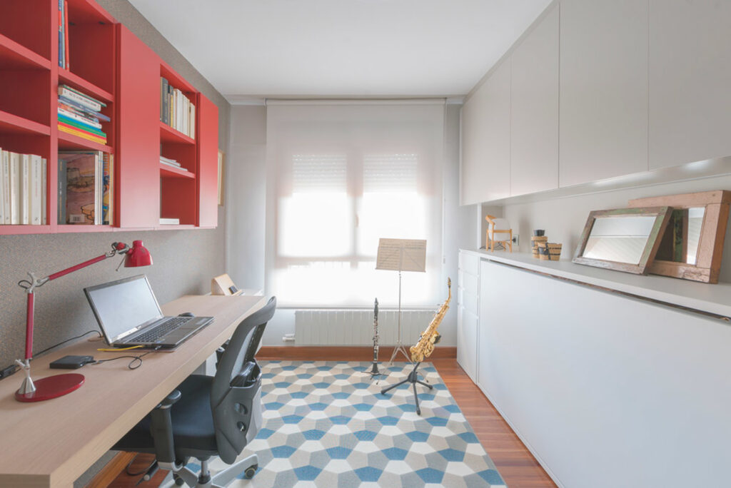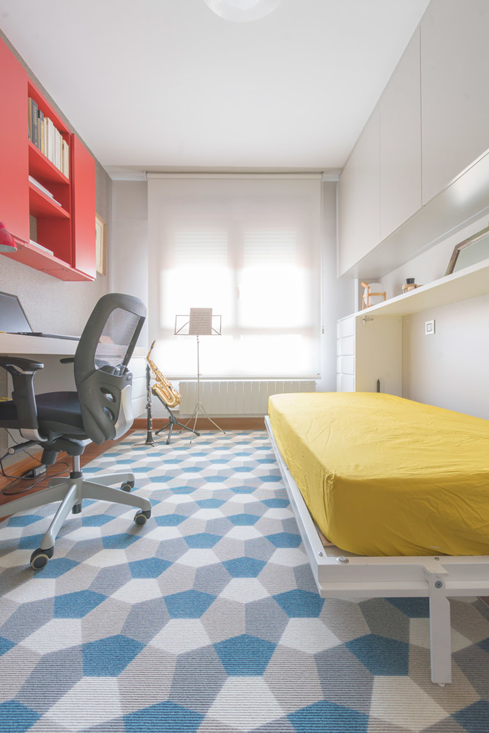 La paleta de colores del espacio sigue una tendencia de tonos neutros, que aportan serenidad y amplitud a todo el ambiente. Para dar un toque de personalidad y dinamismo, incorporamos detalles de color en varias estancias. En el dormitorio multifuncional, una alfombra estampada en tonos azules se convierte en el punto focal del espacio, aportando color y textura. Además, un armario rojo introduce un contraste vibrante, complementando la estética general del hogar sin restar armonía.