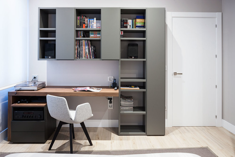 En este piso céntrico en Galdakao, realizamos una transformación integral de un antiguo dormitorio, convirtiéndolo en un espacio multifuncional que satisface dos necesidades clave: un estudio de música y un dormitorio para visitas. Los propietarios, apasionados de la música, querían un lugar donde pudieran tocar sus instrumentos, como el saxofón y el clarinete, sin renunciar a la comodidad para alojar a sus invitados.