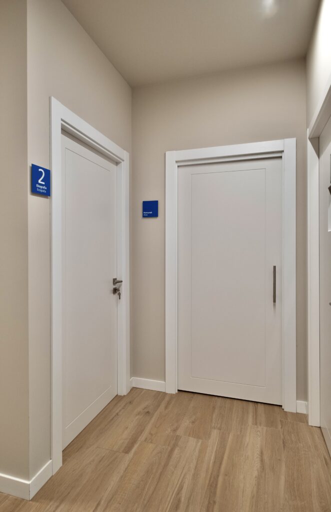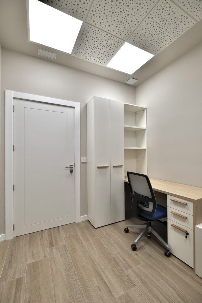 En cada uno de nuestros proyectos, utilizamos materiales de alta calidad que garantizan durabilidad y fácil mantenimiento. Además, seleccionamos acabados que no solo contribuyen a un ambiente higiénico y profesional, sino que también mejoran la estética y confort del espacio. Para asegurar la comodidad y el bienestar de los pacientes, elegimos colores neutros que generan una sensación de amplitud y limpieza, mientras que los detalles en madera aportan un toque de calidez al ambiente.