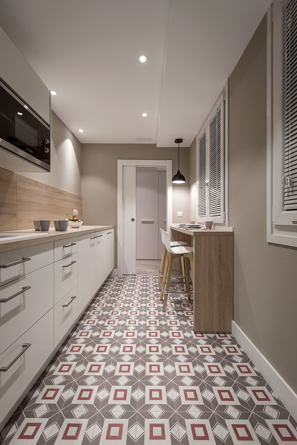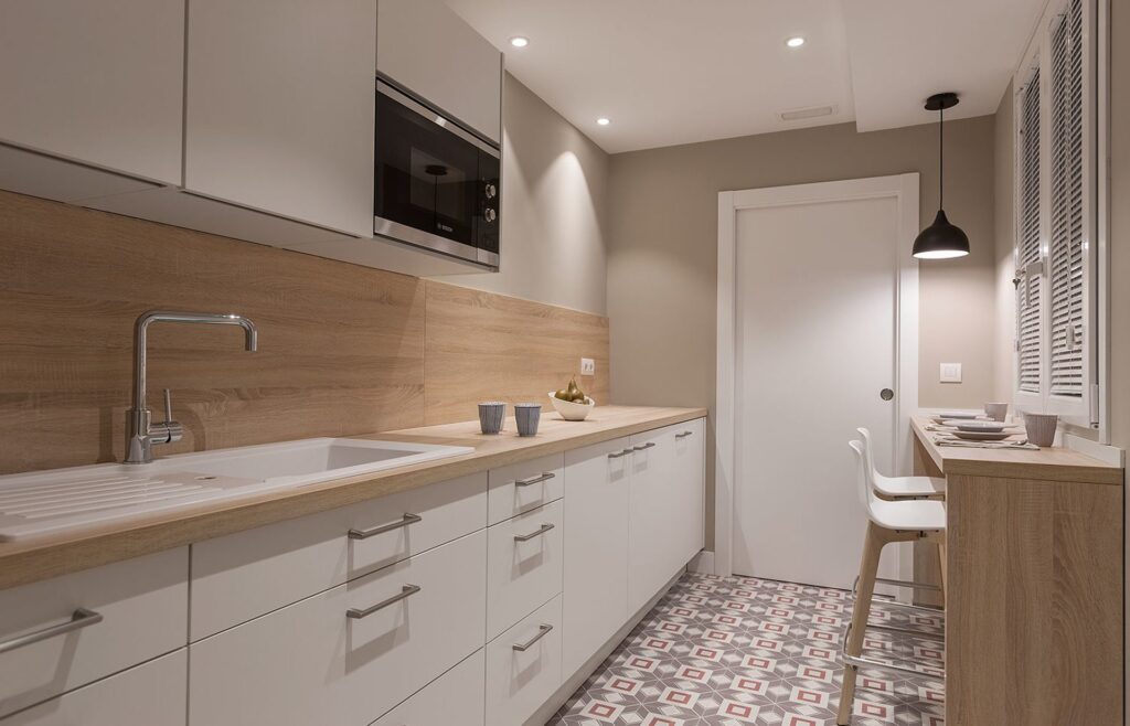 Además, uno de los elementos más distintivos del proyecto es el suelo, revestido con azulejos en tonos rojizos y beige. Esta elección no fue casual, ya que el uso de colores cálidos en el pavimento aporta dinamismo y carácter al espacio. En consecuencia, se consigue un contraste armonioso con los muebles blancos, logrando un ambiente con identidad propia. Asimismo, este recurso estético refuerza la sensación de confort y convierte la cocina en un lugar funcional, pero también memorable.