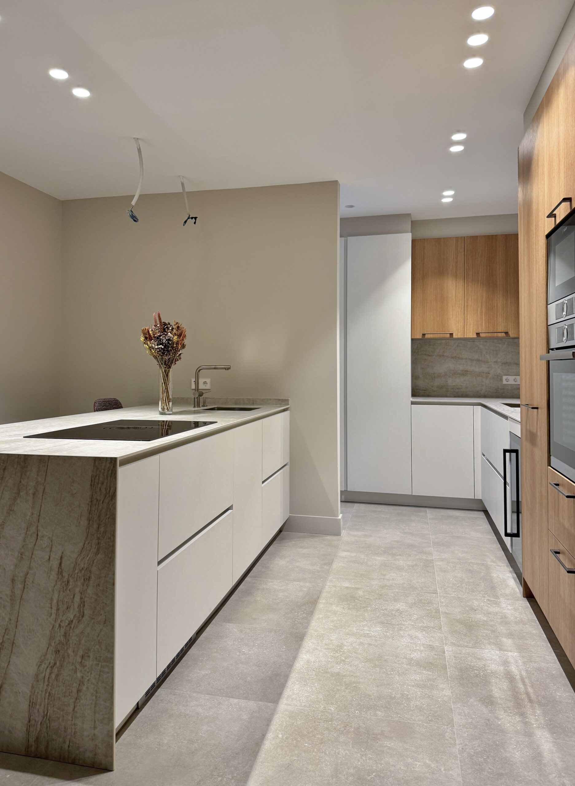 Si bien la zona de noche no sufrió grandes modificaciones, se realizaron cambios significativos en la zona de día. La cocina y el comedor se unieron en un único espacio abierto, lo que no solo mejoró la distribución, sino que también aportó amplitud y luminosidad a toda la estancia. Este diseño contemporáneo optimiza el flujo del espacio, creando un ambiente más acogedor y práctico para el día a día.